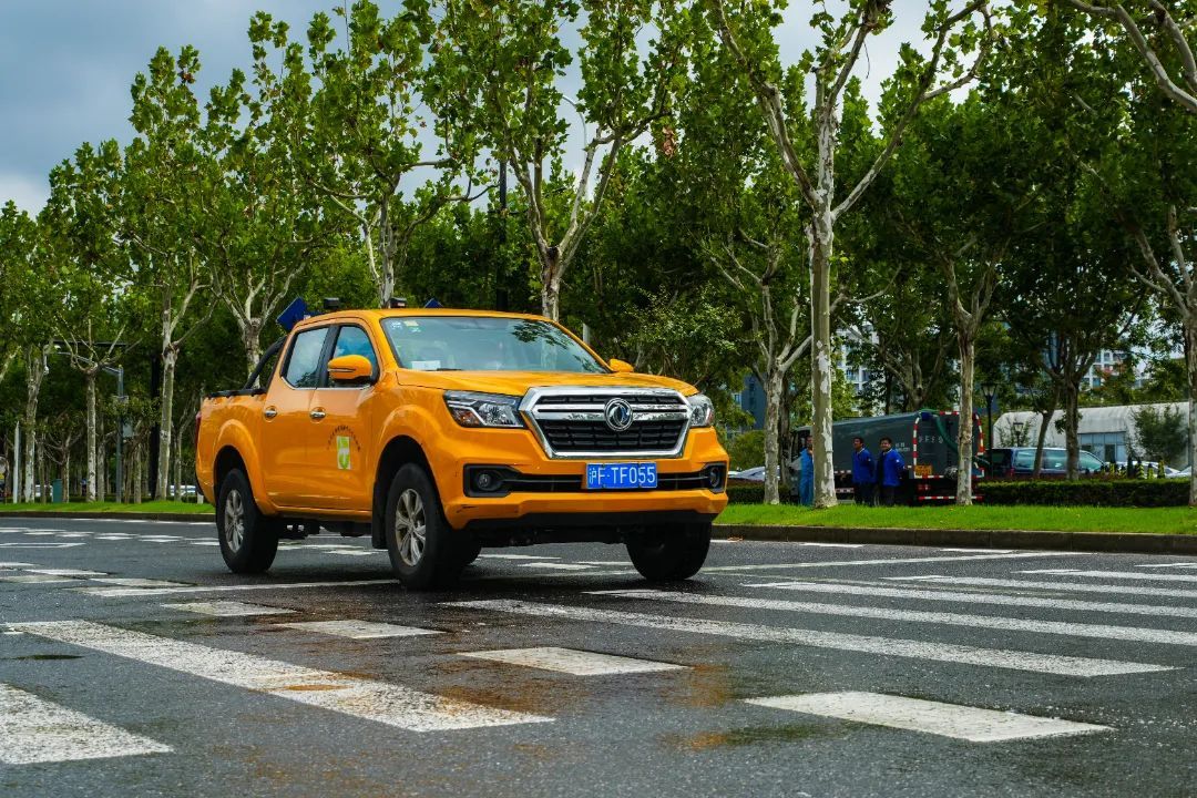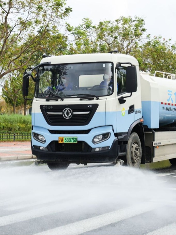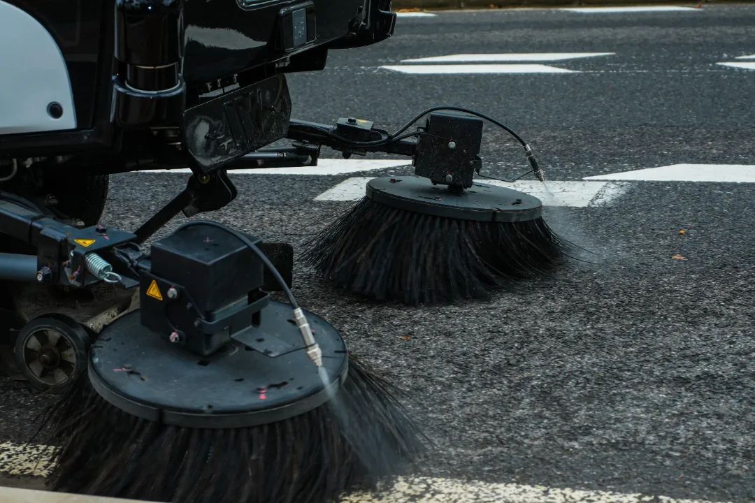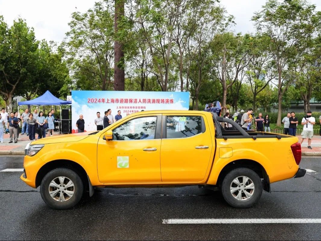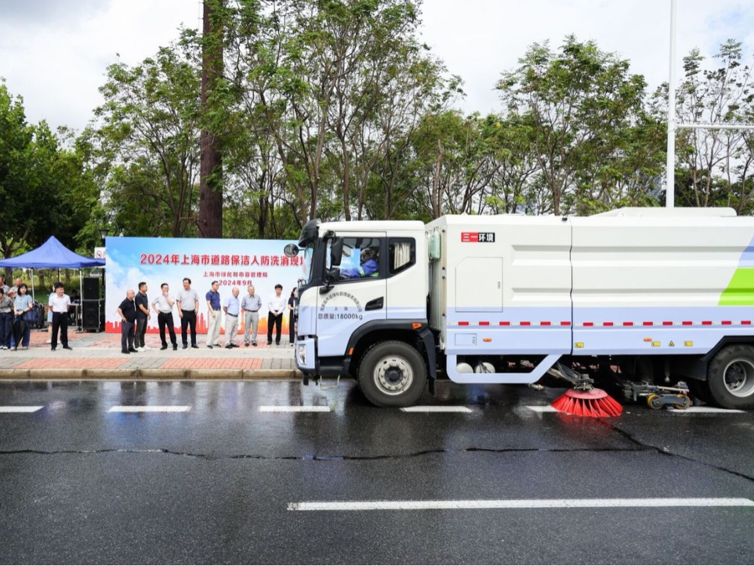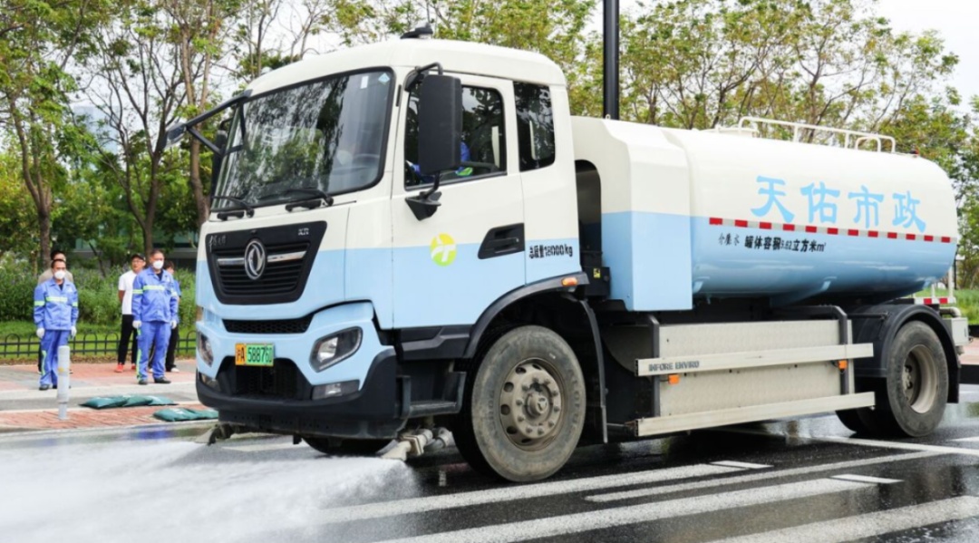 新能源冲洗车、新能源清扫车组团作业实施二次处置。以“冲洗扫喷一体化”作业模式同向同频作业。
