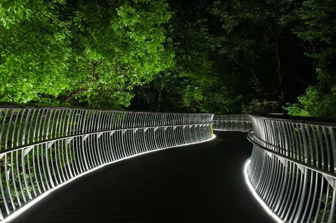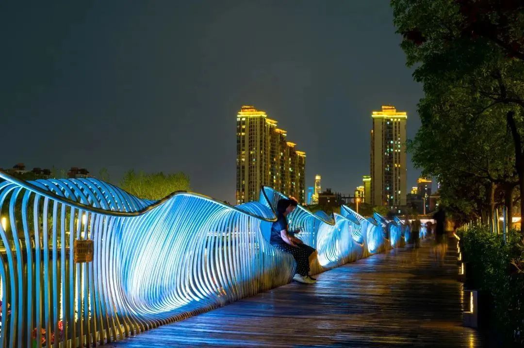 位于天原河滨公园的苏州河景观步廊,300余米的空中步廊两侧均安装了夜间照明灯光,保障行人行走安全的同时,增加艺术灯光效果。