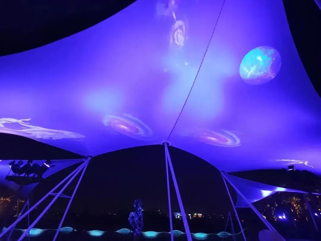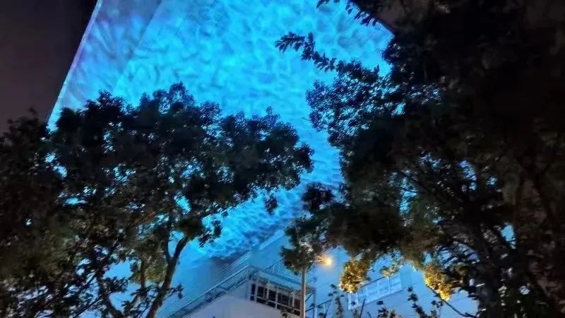 风铃绿地的广场里采用投光灯进行染色,张拉膜上静态图案灯具投影映衬水面,光影碧波荡漾。投光灯可切换红色、紫色、蓝色等色彩。配合“风铃绿地”主题,“风铃草”景观灯具清新雅致,白天如绿丛中的花朵,夜晚则成为星星点点的照明灯光,增添艺术感染力与趣味性,营造静谧优雅的氛围。