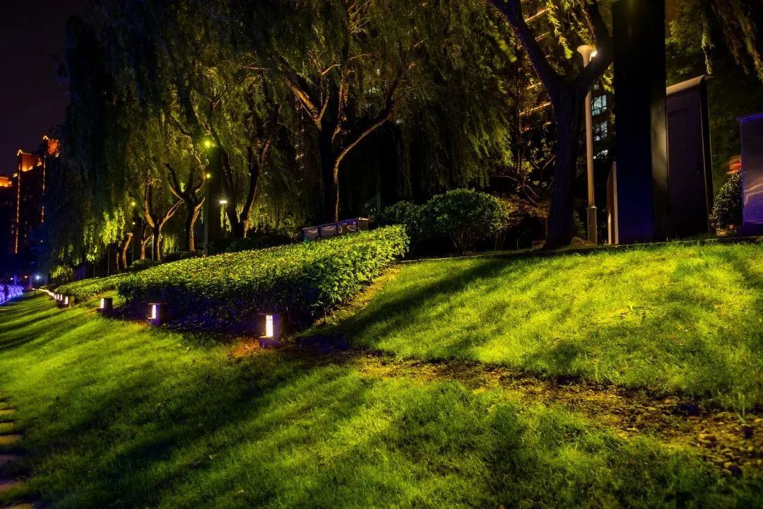 虹桥河滨公园的夜景独具滨水特色,艺术栏杆采用动态灯光结合草坡上的波浪投影互动,配以护坡上的特色漏光灯饰,营造出惬意怡人的氛围。漫步岸边,灵动的波浪栏杆与沿岸建筑的立面光影交相辉映,共同打造出一种律动的河岸景观,让整个公园充满了生机与活力。