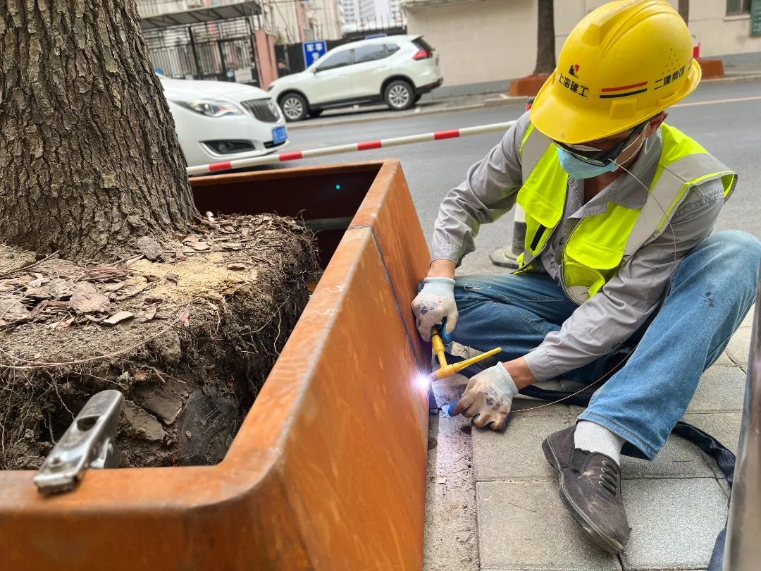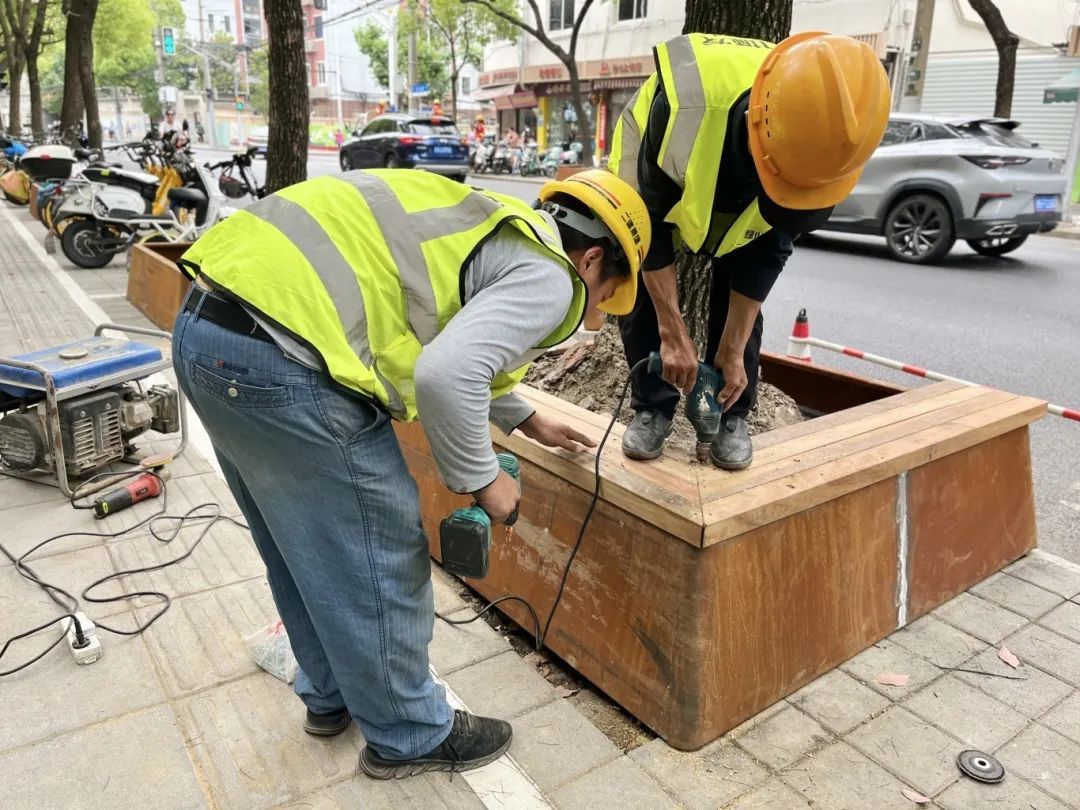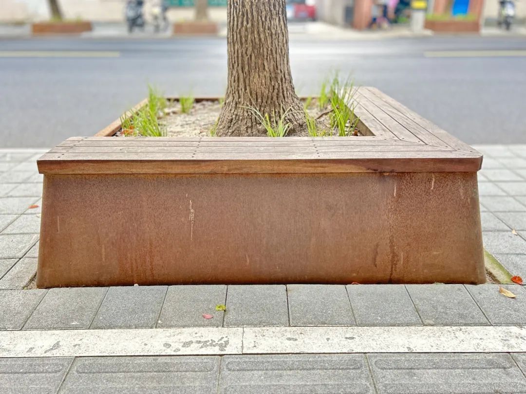 为彻底改善这一状况,区绿化市容局启动了树池改造工程。此次改造工程对运光路上81个行道树树池进行了全面升级,用耐候钢替代了原有的砖混结构,并在表面喷洒氧化剂,形成氧化铁膜,不仅显著提升了树池的牢固度,还使其具有更强的耐腐蚀性和防锈能力,大大延长了树池的使用寿命。