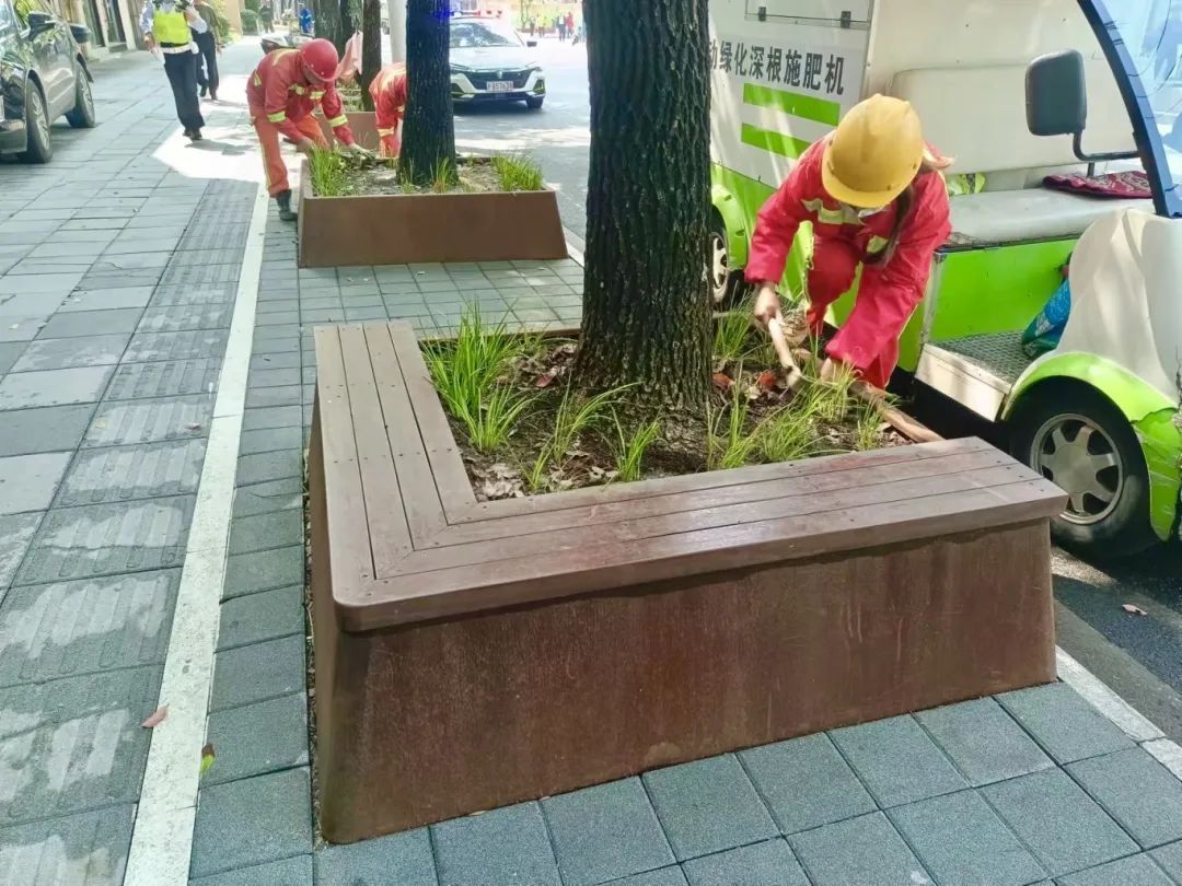 值得一提的是,部分树池还加装了坐凳,为过往的路人提供舒适的休憩空间,体现了城市的人文关怀。