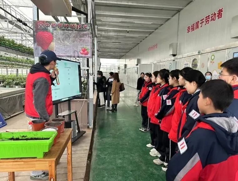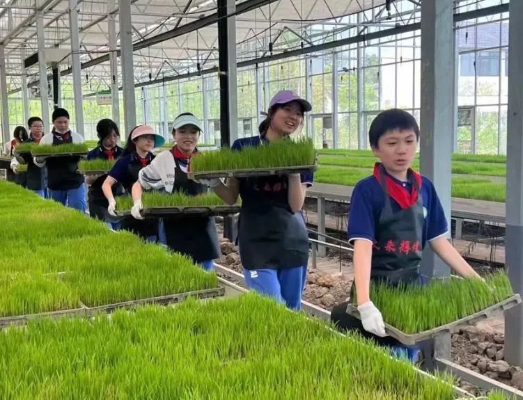走进合作社2号大棚,抬头是培育在空中的草莓,中间的操作台种植各类多肉植物,底下铺设着稻草,一颗颗大球盖菇长势正好,让当天来参观的五年级孩子们看得连连惊呼。在育秧一体化设备投入使用前,这里是育秧温室,如今已成为劳动教育实践基地的主要承载地。“我们想让小朋友看到,农业也可以科技满满,由此建立对现代农业的概念,在他们心中播撒农业的种子。”