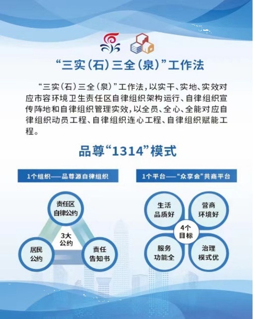 品尊源自律组织成立以来,创新性地建立“三实(石)三全(泉)”工作法,将实干、实地、实效与市容环境卫生责任区的自律组织架构运行、宣传阵地建设以及管理实效紧密结合,旨在通过整合区域资源,形成“共建、共管、共治、共享”的治理模式。围绕这一治理模式,品尊源自律组织推行了全域门责制,在卫生整治、垃圾分类、资源共享等领域积极作为,有效促进了商户从“被动管理”向“自我管理”的转变,推动了区域环境管理从“他律”走向“自律”。