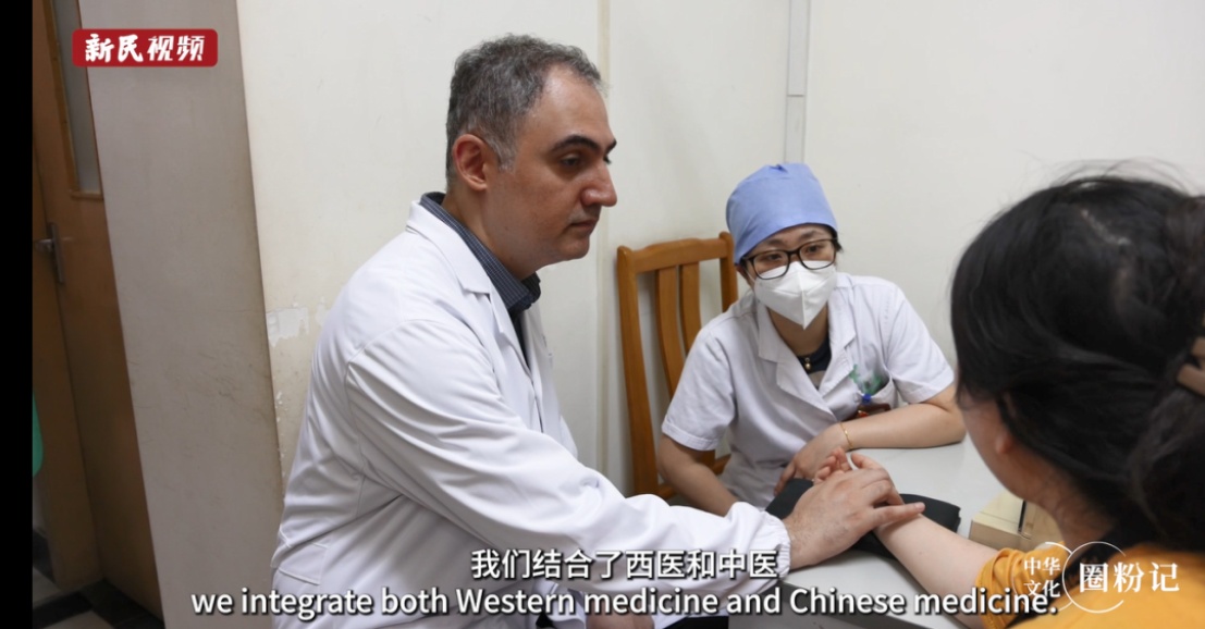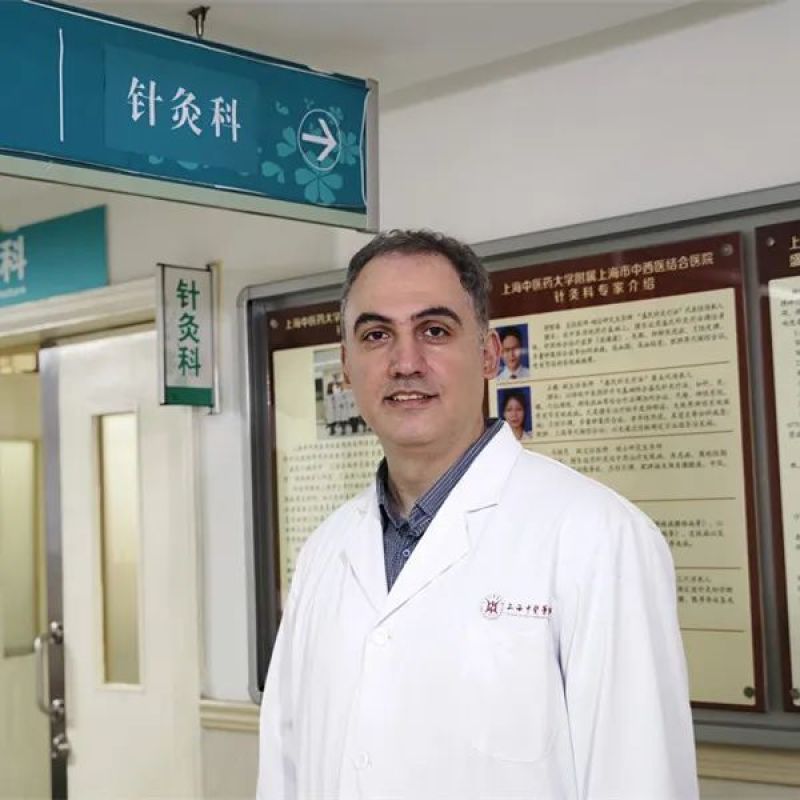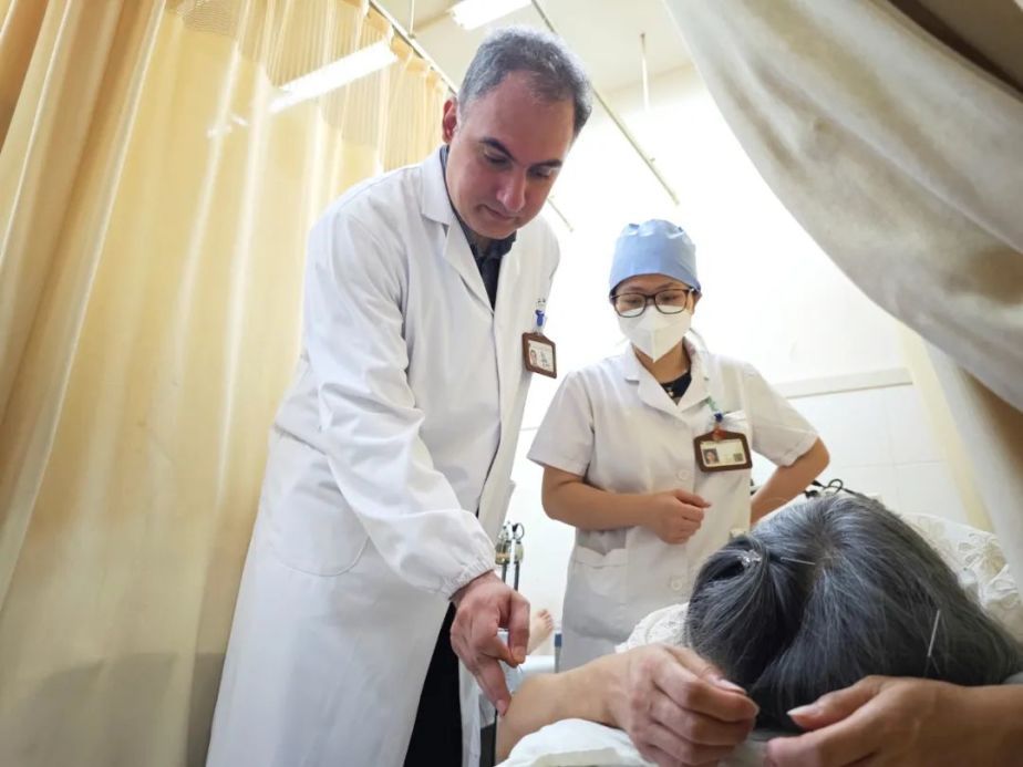 来自伊朗的易正,是上海中医药大学针灸推拿专业的在读硕士。他身着整洁的白大褂,坐在一位病人身边准备施针。他的导师——上海市中西医结合医院针灸科科主任王毅在旁给予指导。