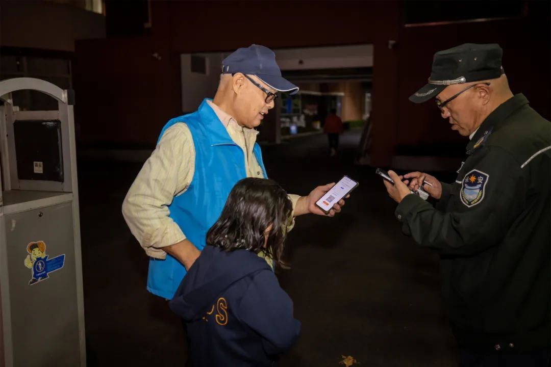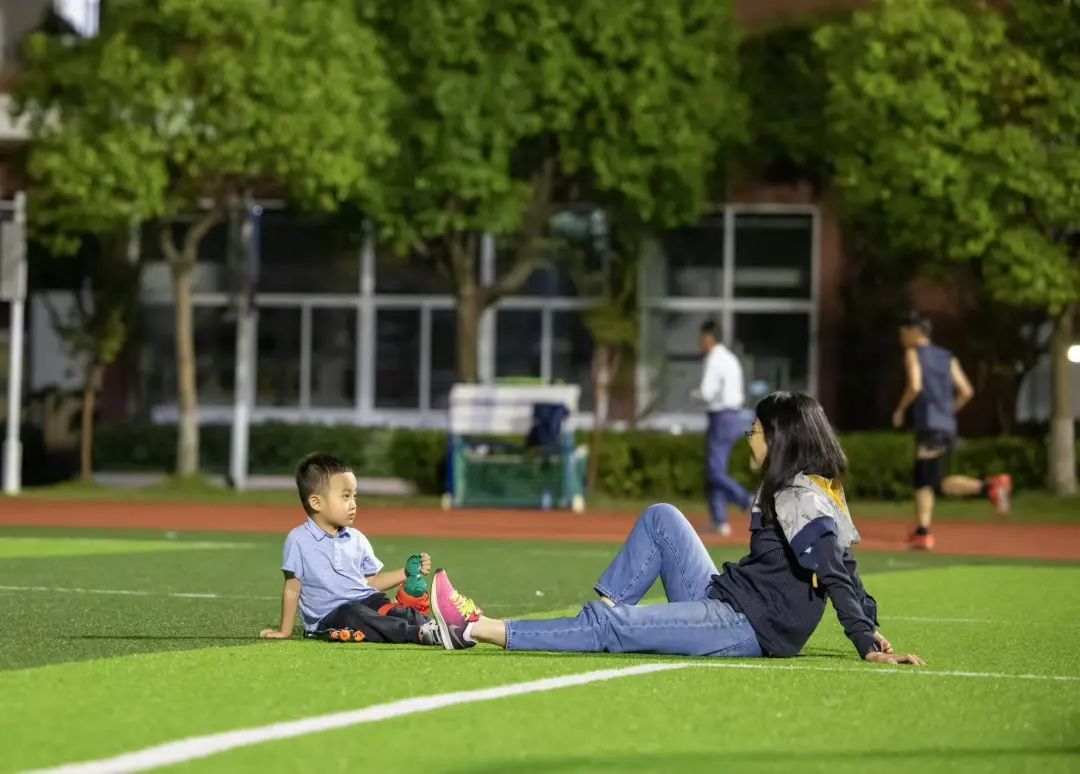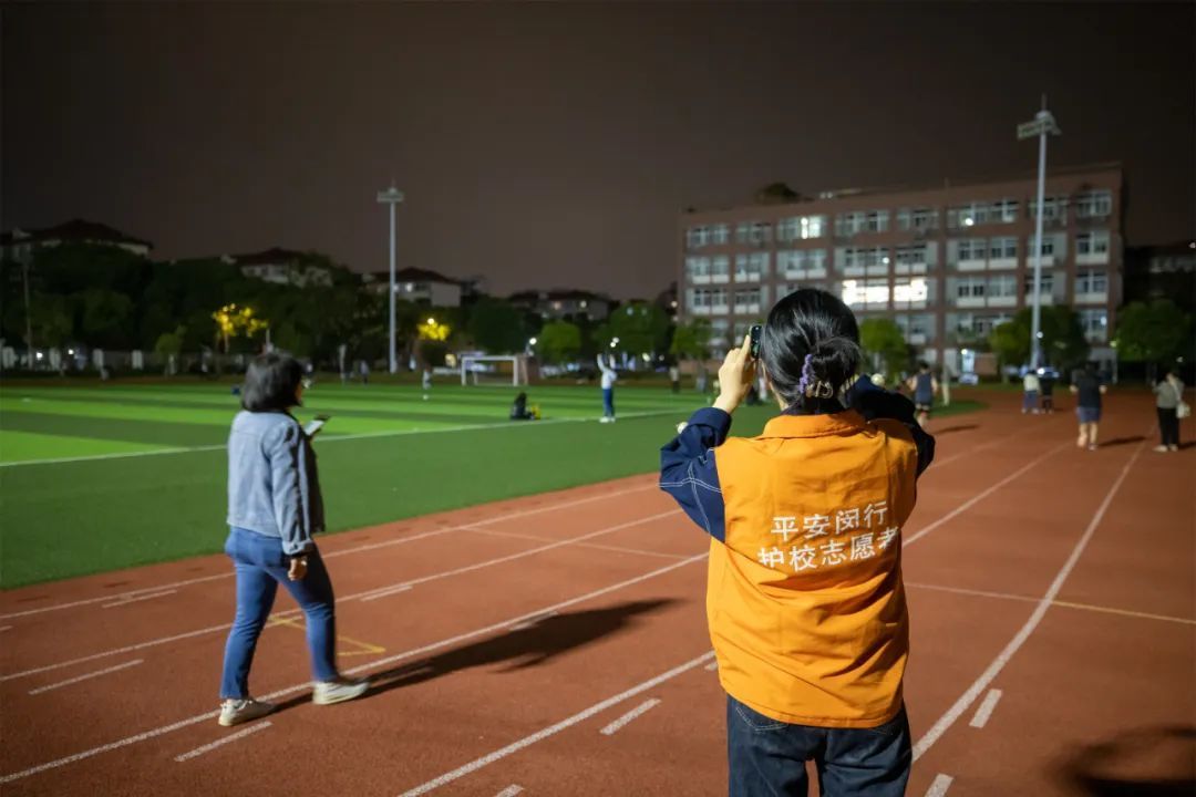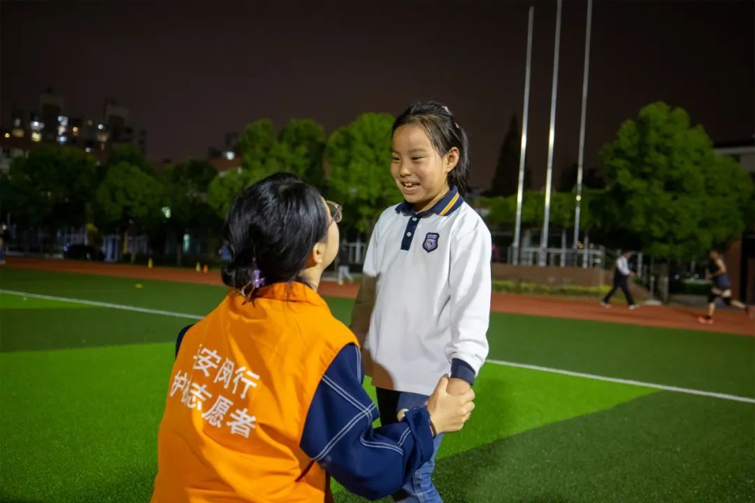 程果是当晚的场地开放的教师志愿者,记者跟随她一同巡视操场时,还“捕获”了一个“小可爱”——程老师自己班级的学生。程老师告诉记者,教师志愿者们都非常认真,会在志愿者群打卡,汇报当天的情况。“今天不单是我做志愿者,我还把老公一起拉来锻炼了。”她笑着说。