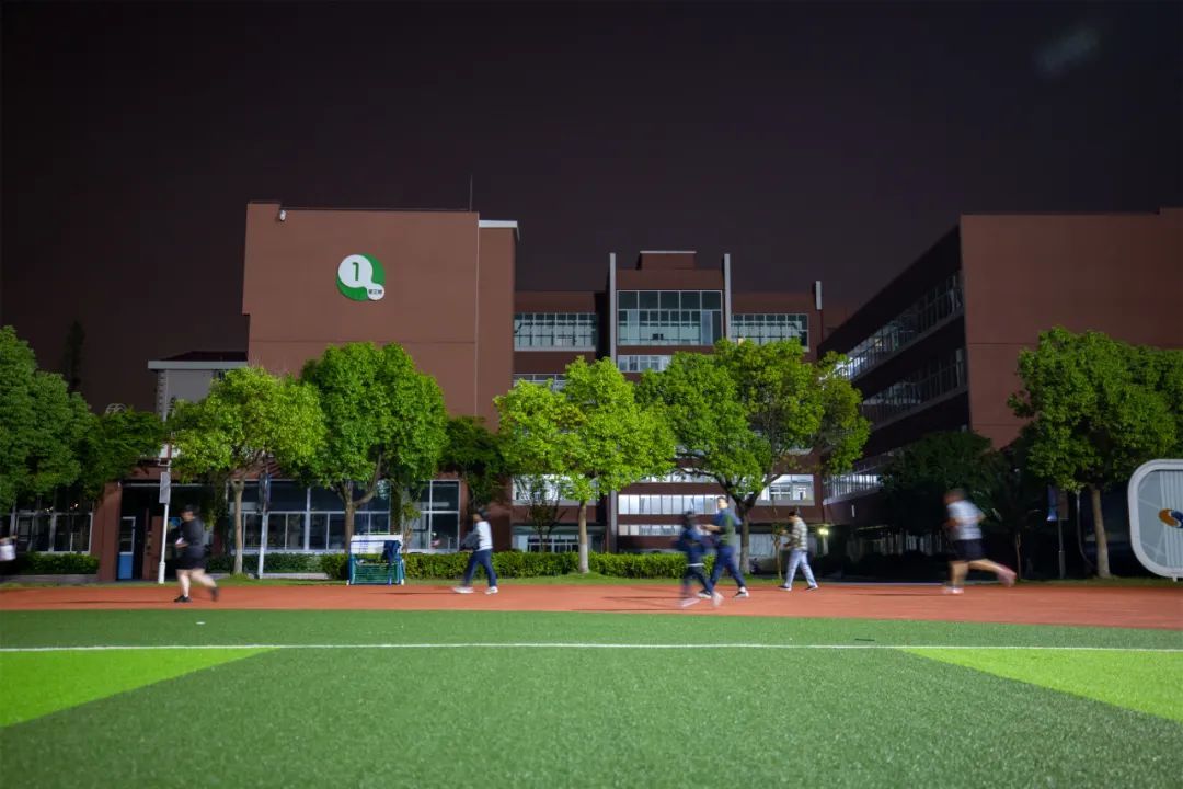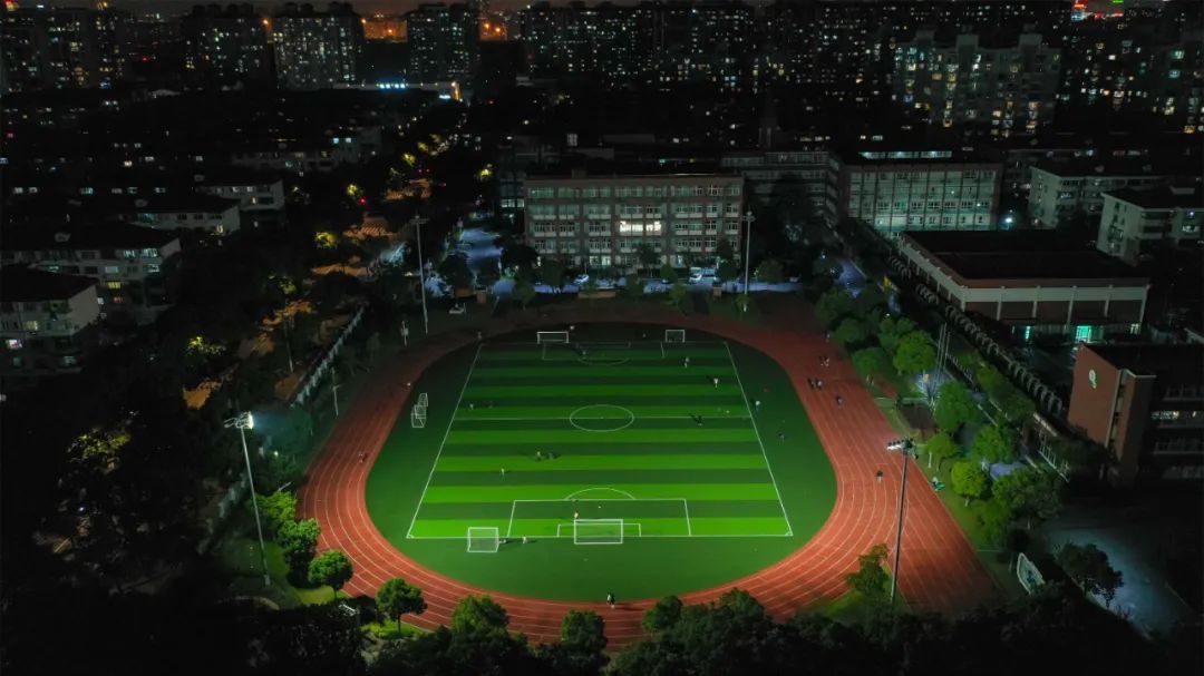 闵行区实验小学畹町校区的场地灯光在周围居民楼的灯火映衬下格外醒目