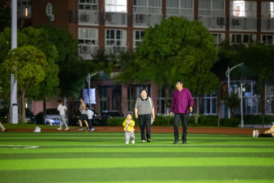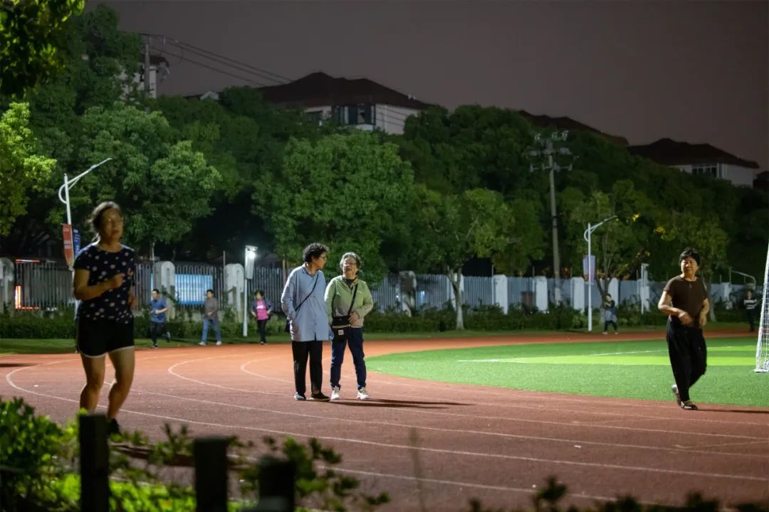操场上,各式各样的身影构成了一幅美好和谐的画面:有的市民悠闲地散步聊天,有的则快步行走,一边还甩手拍肩,更有不少年轻跑步爱好者,穿戴专业,尽情享受着运动的乐趣。
