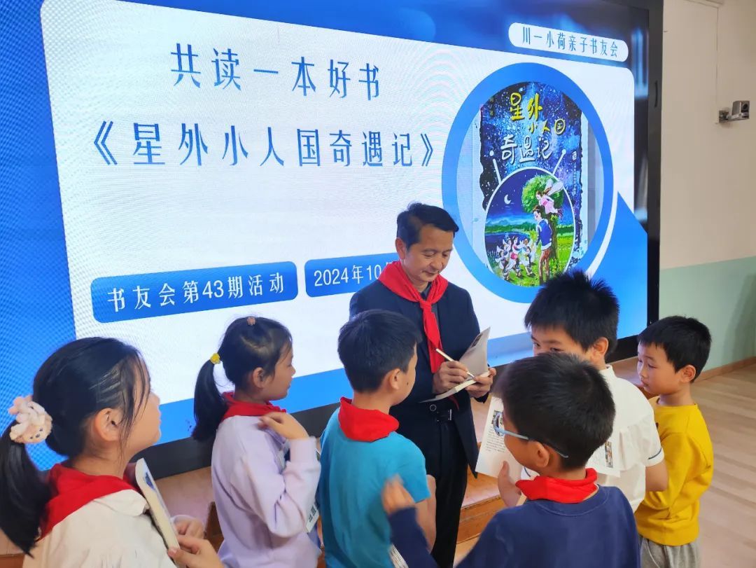 10月25日下午,四川北路第一小学图书馆内热闹非凡,在学生们及其家长的热烈掌声中,“川一小荷亲子书友会”迎来了上海市静安区教育学院科研员、中学高级教师、科幻儿童畅销书作者陆少明老师,为亲子家庭作阅读讲座,并与学生们分享阅读与文学创作的乐趣。现场,热情的少先队员给陆少明戴上鲜艳的红领巾,向他致以少先队最崇高的敬意。