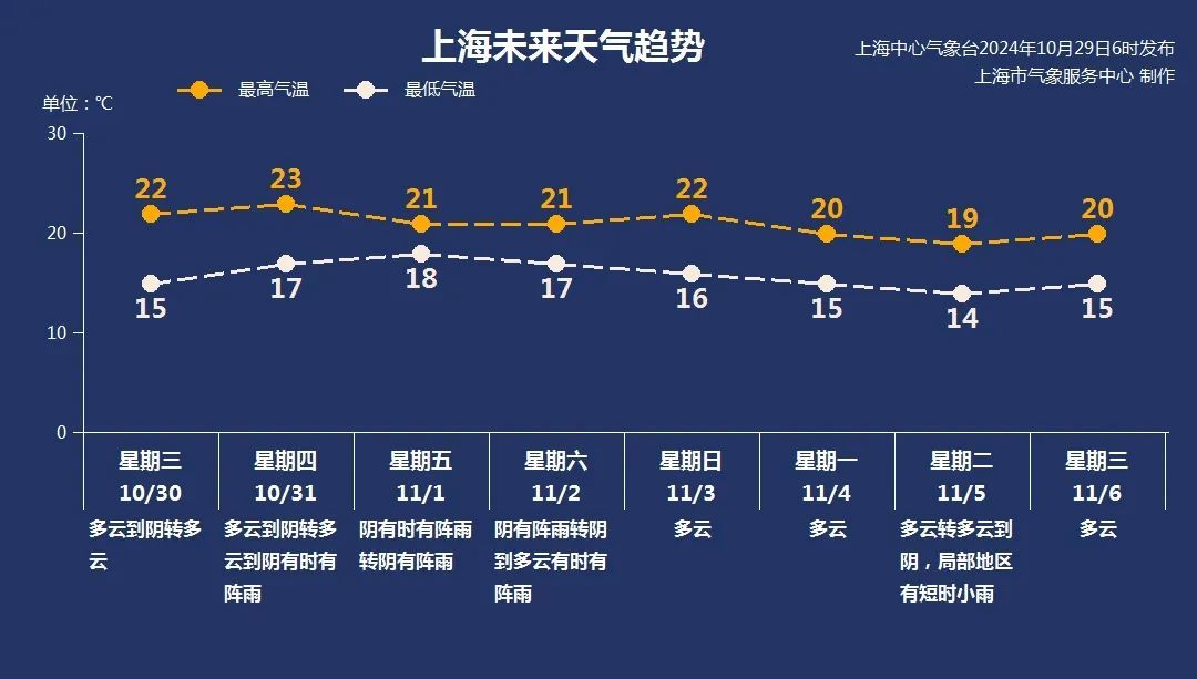 上海今天(10月29日)多云到晴,气温14~21℃,相对湿度90%~50%。北到西北风3~4级,沿江沿海地区4~5级,中午起4~5级,沿江沿海地区阵风6级。早晚气温较低,请注意添衣。