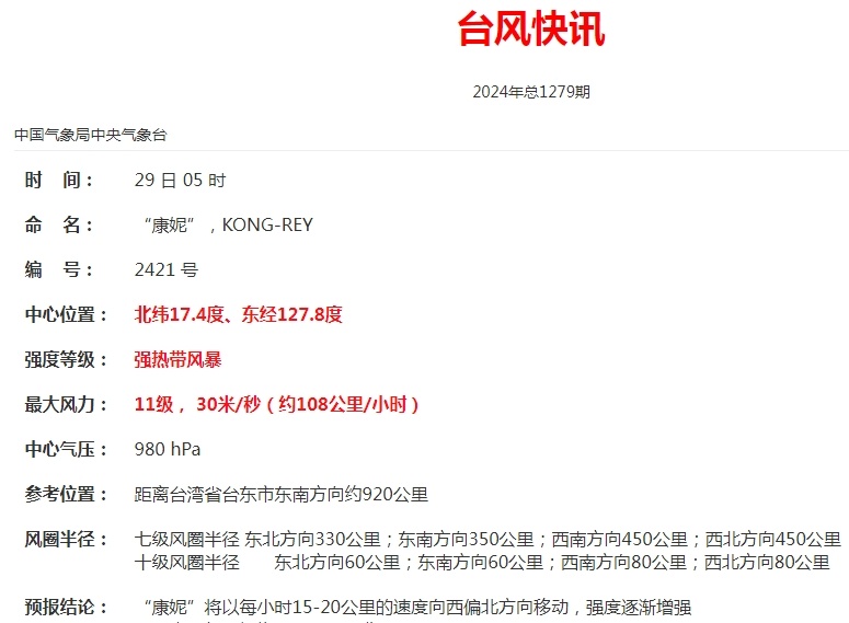 今年第21号台风“康妮”今天早晨5时距离台湾省台东市东南方向约920公里,维持强热带风暴级,预计它将以每小时15~20公里的速度向西偏北方向移动,强度逐渐增强。