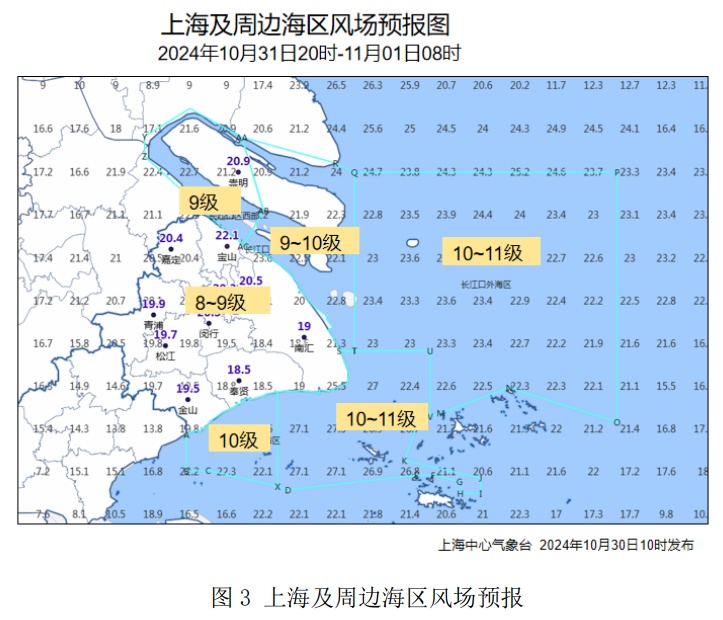 大风影响:10月31日夜里起本区风力逐渐增大,11月1日最大陆地阵风8~9级,长江口区阵风9~10级,11月2日下午风力逐渐减弱。