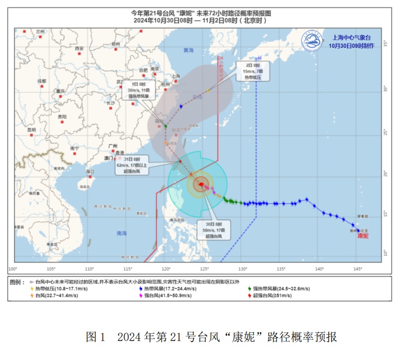 路径和强度:目前主流数值模式和大模型的预报趋于一致,预计“康妮”将以每小时15~20公里的速度向西北方向移动,强度还将有所增强,将于10月31日中午到下午在台湾岛南部或中部登陆,尔后沿浙闽沿海一带近海北上(也可能在上述沿海地区登陆或擦过),强度迅速减弱。