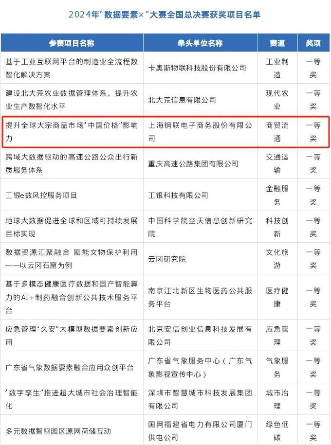 近日,备受瞩目的2024年“数据要素×”大赛全国总决赛圆满落幕,上海钢联电子商务股份有限公司(以下简称“上海钢联”)凭借出色的表现,从12个赛道10万参赛者中脱颖而出,荣获全国总决赛一等奖,成为全国商贸流通赛道的优秀引领者。