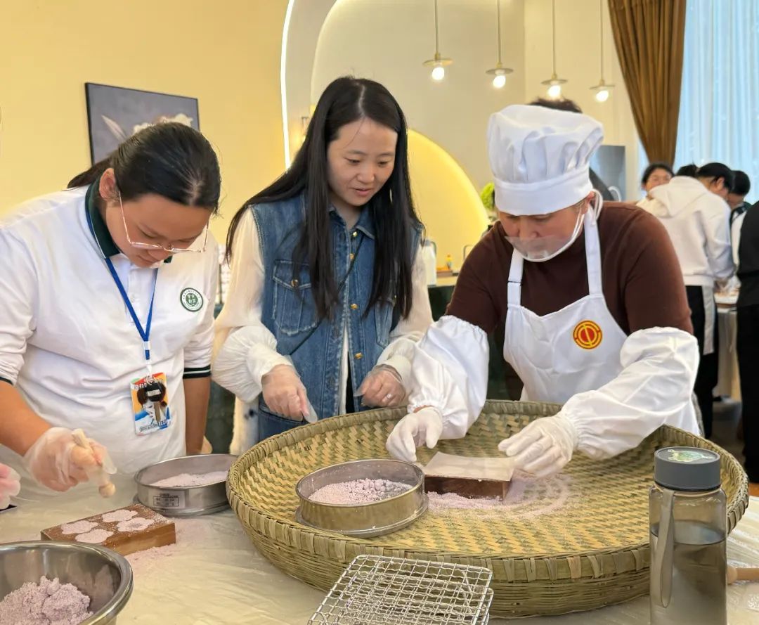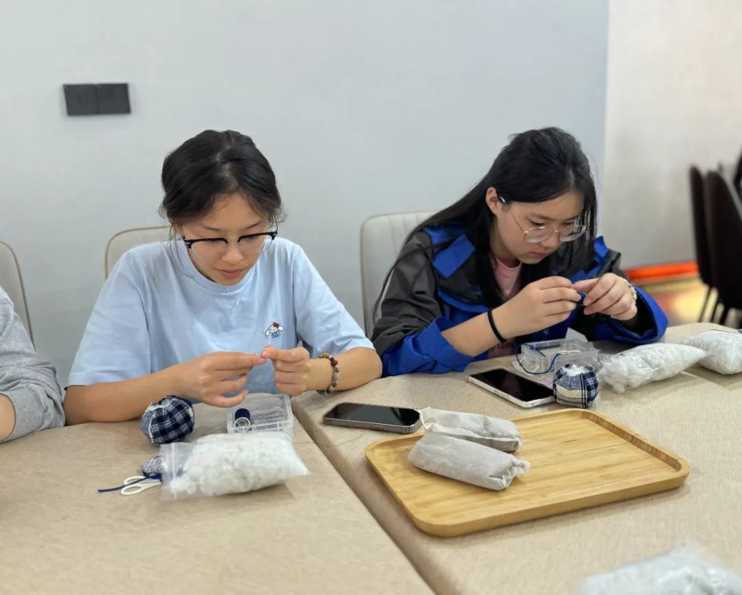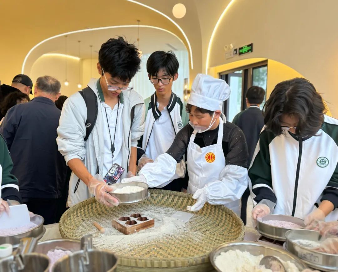 下午1点半,光隐花隅民宿内散发着米香,餐桌旁各色米粉、模具齐备。在村中阿姨的指导下,学生们围坐成圈,将由糯米、粳米混合、细磨后的米粉与适量绵白糖充分混合,并仔细地把米粉细筛入特制模具。调制加馅、筛粉刮平、翻身脱模……学生们做得认真,一块块整齐的非遗软糕新鲜出炉,香味四溢。而在一旁的叶榭筘布手工课堂中,学生们手持针线缝制布头,挺括紧实的老布在巧手拼接下呈现出别样的传统韵味。新奇且有趣的乡村非遗体验活动让不少学生印象深刻,“感觉很新颖,从来都没有体验过。”学生施婧雯说,“手工匠人们精益求精的精神令人钦佩”。
