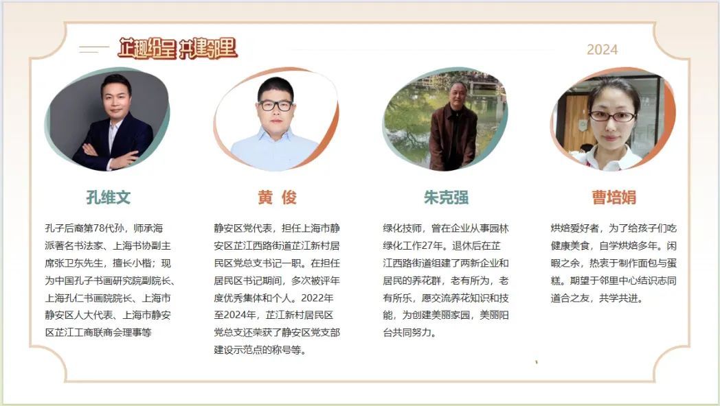 首批的4位“邻馆长”分别是区人大代表孔维文、党员代表黄俊、居民代表朱克强和曹培娟,他们将分别担任中心书画社书法顾问、中心党员活动顾问、芷爱绿意生活家社群主理人和芷爱烘焙美食家社群主理人,成为连接社区居民与邻里汇的桥梁。