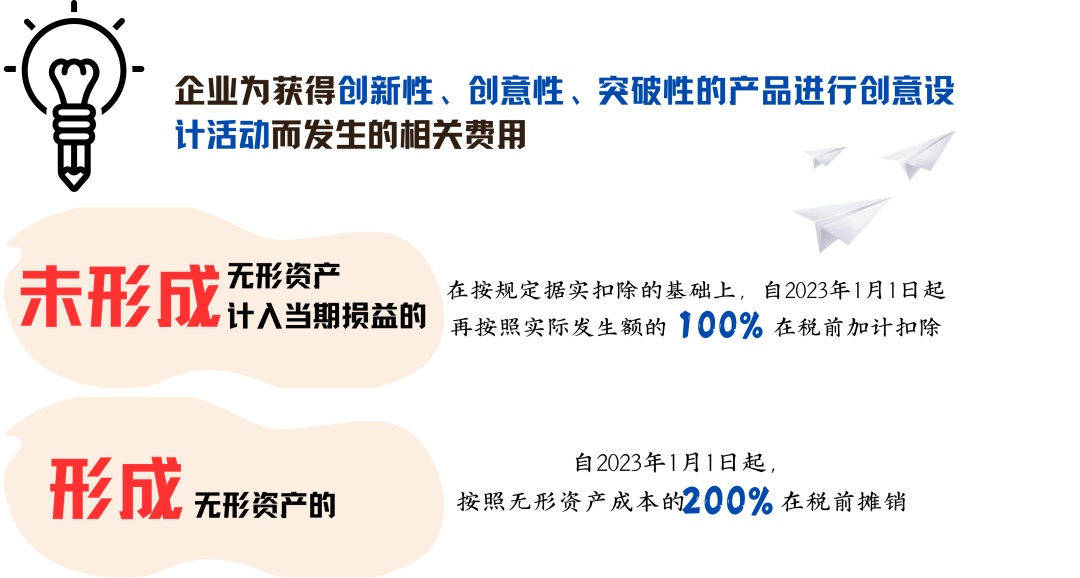 2.企业为获得创新性、创意性、突破性的产品进行创意设计活动而发生的相关费用,未形成无形资产计入当期损益的,在按规定据实扣除的基础上,自2023年1月1日起,再按照实际发生额的100%在税前加计扣除;形成无形资产的,自2023年1月1日起,按照无形资产成本的200%在税前摊销。