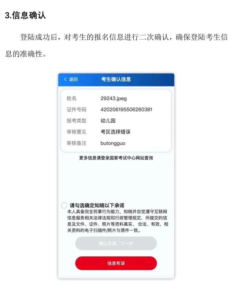 (3)报考人员须按报名页面提示的要求,如实、准确填报本人信息并对信息的准确性负责,所有报考信息审核通过后将不得做任何修改,由于填报信息差错导致的后果由考生本人承担。