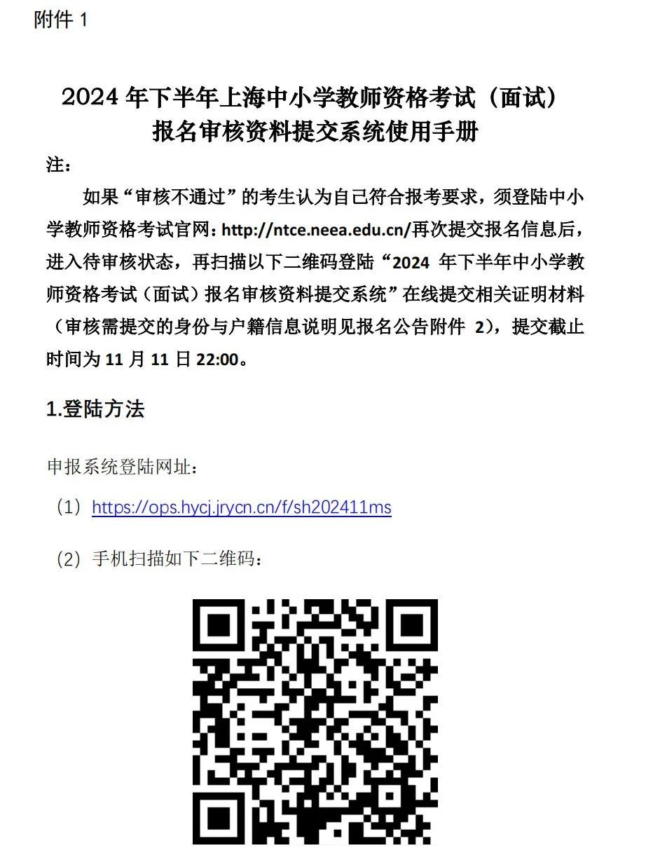 2.11月11日(星期一)9:00起考生自行登陆报名网站,若显示“审核通过”,表明考生符合报考条件通过了资格审核;若显示“审核不通过”,表明考生填报信息与市大数据中心查询的信息不一致,智能审核未通过。如果“审核不通过”的考生认为自己符合报考要求(如近期内已取得上海市居住证等),须登陆中小学教师资格考试官网:http://ntce.neea.edu.cn/再次提交报名信息后,进入待审核状态,再扫描以下二维码(或进入网址https://ops.hycj.jrycn.cn/f/sh202411ms)登陆“2024年下半年中小学教师资格考试(面试)报名审核资料提交系统”(系统使用手册见附件1)在线提交相关证明材料(审核需提交的身份与户籍信息、学历信息说明见附件2),提交截止时间为11月11日(星期一)22:00。