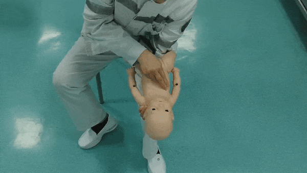 然后单手用力拍击两肩胛骨之间5次,再将婴儿翻正,用食指及中指压胸骨下半段5次。