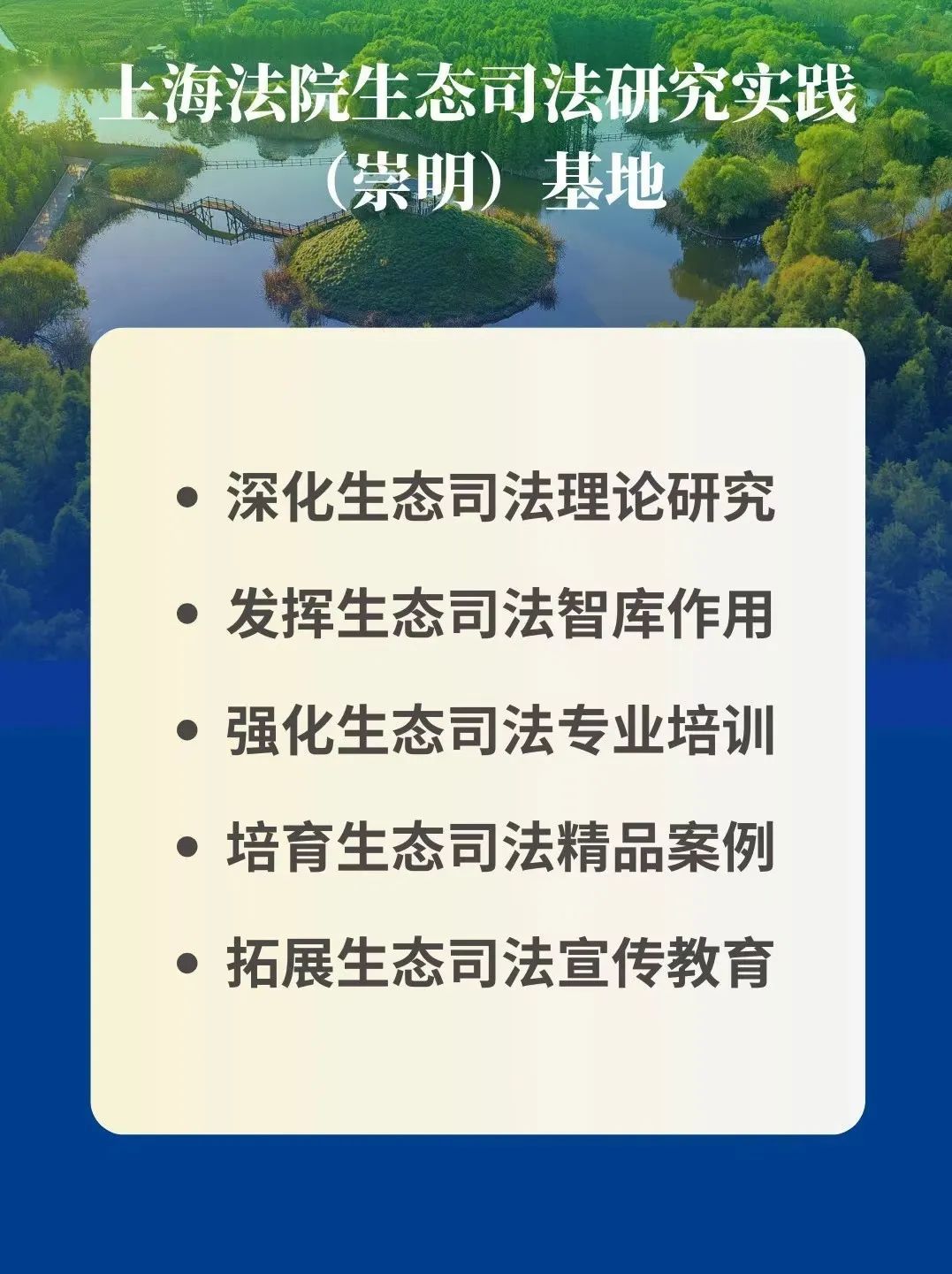 为深入践行“两山”理念,积极推进长江经济带生态文明建设,深入推动长三角生态绿色一体化发展和世界级生态岛建设,活动中,王光贤、刘小飞、俞秋玮、龚朝晖、金彪共同为上海法院生态司法研究实践(崇明)基地揭牌。