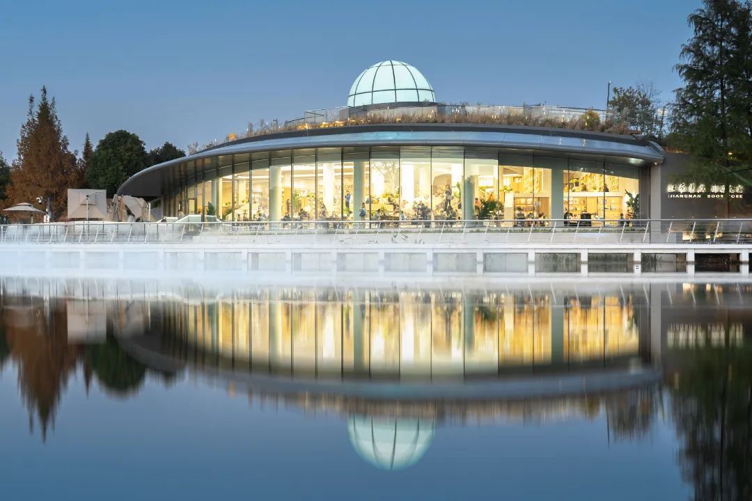 江南书局·疁城之瞳仿佛城市文化脉络中的一颗璀璨明珠,引领人们走进知识的海洋,感受文字间流淌的江南韵味与深邃智慧。错落有致的绿植环绕间,市民品茗阅读,成为湖畔一道亮丽的风景线。