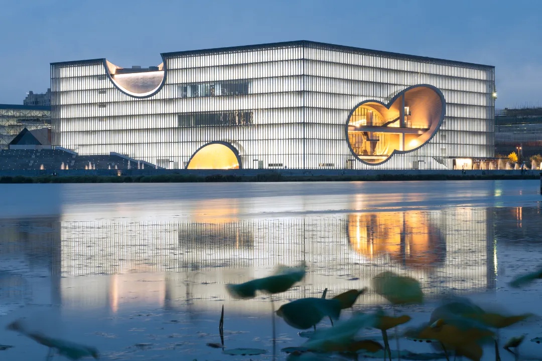 上海保利大剧院的外墙包裹着玻璃、混凝土、木材,其立体造型、日夜光线、不同材料融洽相处,相得益彰。水景剧场中,波光粼粼的池水柔化了建筑的刚健。每到荷花绽放的季节,更是吸引众多市民前来观赏留影。