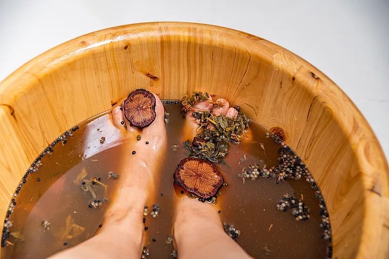 小提示:将中药泡脚方加水或装入熬药袋,先浸泡半小时再煮沸转小火熬20~25分钟即可。泡脚时,水没过踝关节达到踝关节上三寸(四横指高)更佳。