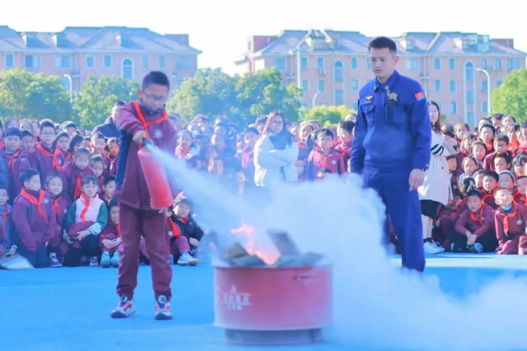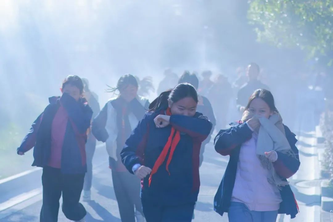 当天上午9时许,演练模拟火情在设定区域开展,现场浓烟四起,火警警报迅速拉响。在老师们的指挥下,同学们沿着逃生路线迅速、有序地跑向操场等空旷地带。在撤离过程中,大家用手或衣物捂住口鼻,防止吸入浓烟,严格按照规范完成应急疏散。紧接着,在消防员的专业指导下,师生代表们上阵体验如何灭火。随着一道道白色干粉从喷嘴中喷出,熊熊燃烧的火焰瞬间被扑灭。