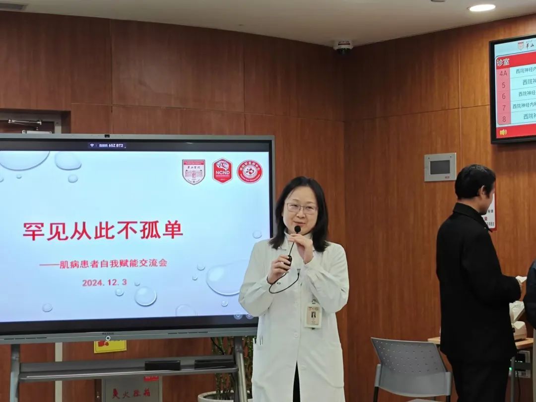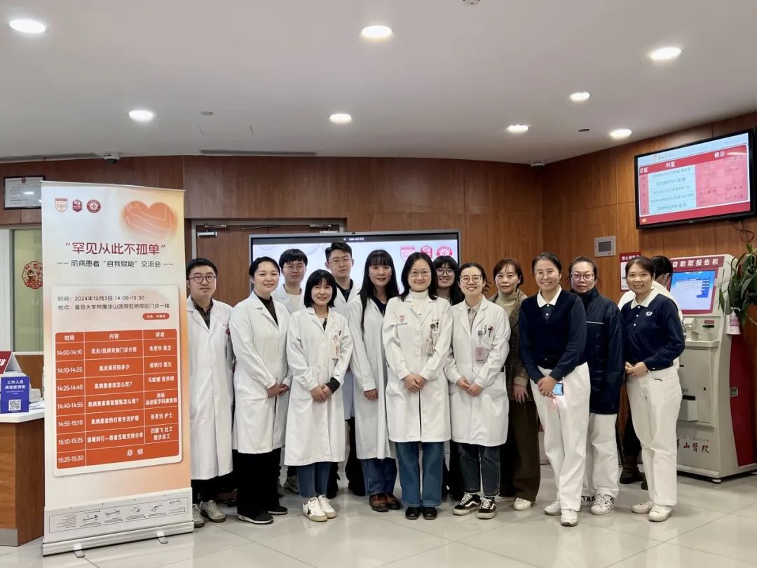 专病门诊开诊当天,一场以“罕见从此不孤单”为主题的肌病患者自我赋能交流会在华山医院虹桥院区门诊一楼候诊区举行,围绕提高居家管理能力主题,华山医院多学科医护团队进行分享。