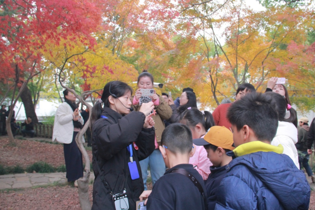 秋霞圃园长徐园娇介绍,在赏秋色活动期间,秋霞圃携手嘉定博物馆,针对各年龄层市民的多元化需求,陆续推出“枫叶科普小课堂”“汉服游园”等互动体验活动,“此外,我们还创新启动‘汉服摄影服务’‘馆园联名赠好礼’特色项目,为广大市民带来多元有趣且老少皆宜的科普、文化游园体验。”
