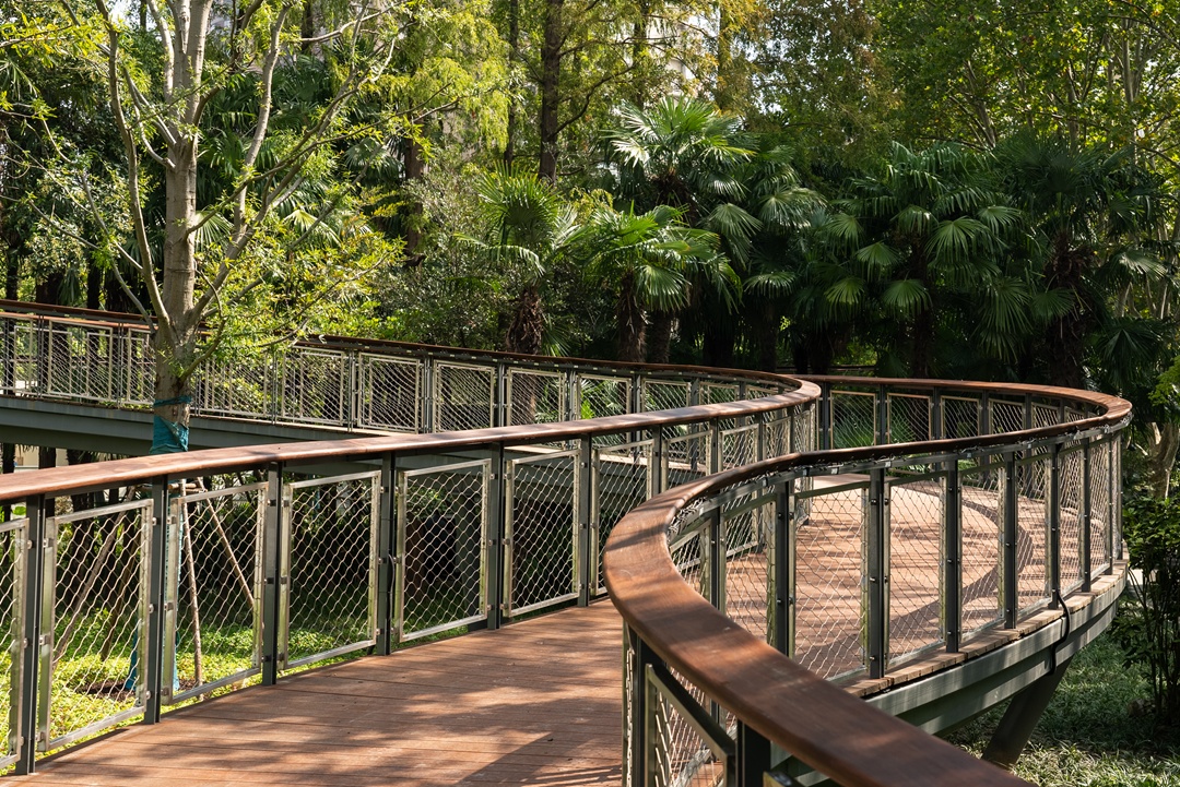 城市山林步道全长约200米,犹如一条穿越城市与自然的“绿色隧道”。这里通过立体设计串联不同的视觉场景,让你在步行的每一步中都有新的惊喜与发现。从高空俯瞰,公园与城市街景交织成一幅流动的画卷,每个转角都充满了未知的魅力。