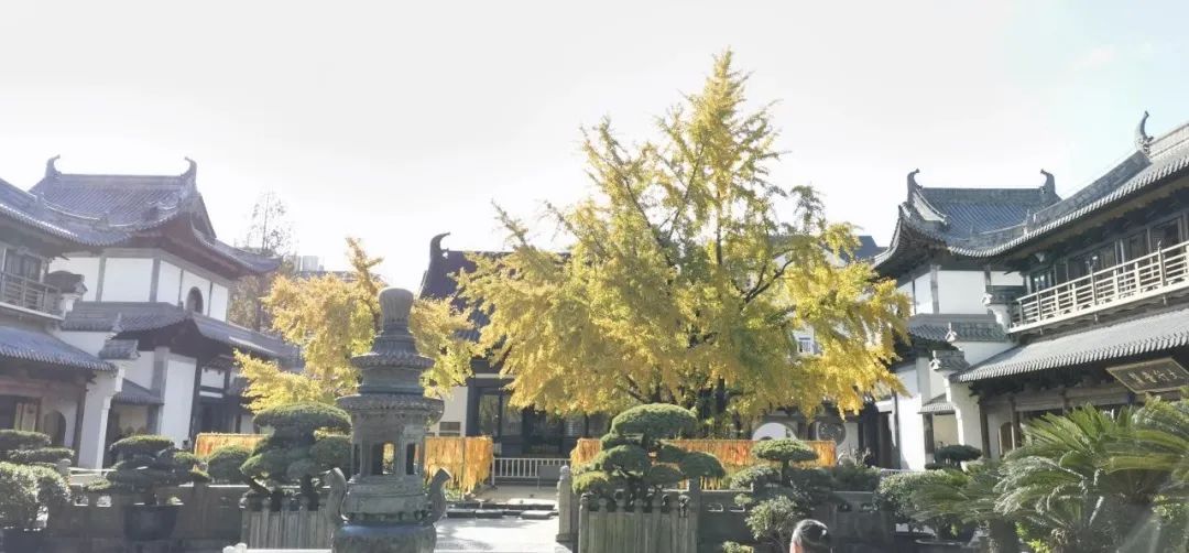 鸽子在叫,树叶会笑。一高一低两棵古银杏树静静矗立在寺院庭前,银杏叶在寒风轻拂下悠悠转黄,宛如一位饱经沧桑的老者,无声地为往来的市民游客捎去大自然的祝福。