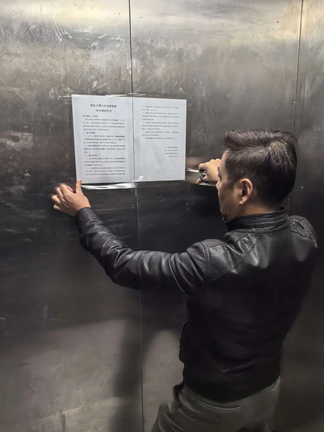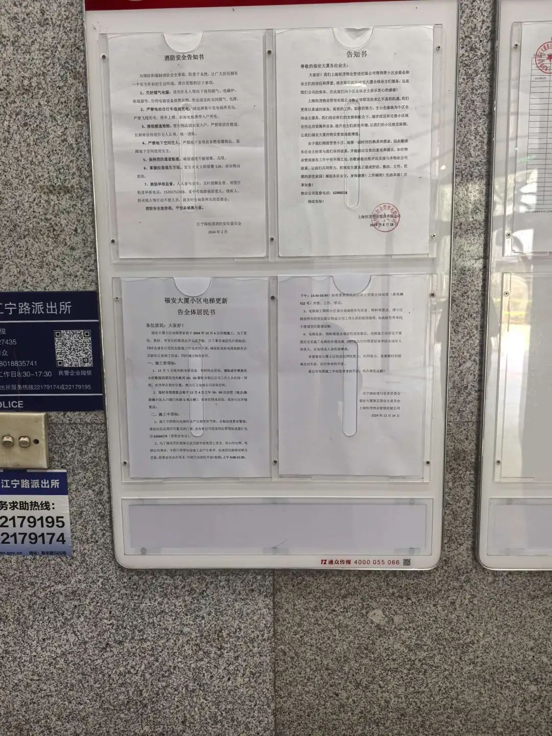 12月4日,江宁路街道句容里居委会、福安大厦第五届业主委员会、上海恒茂物业管理有限公司在电梯内张贴《福安大厦小区电梯更新告全体居民书》,宣布了福安大厦小区电梯更新将于12月6日开始施工的喜讯,同时提醒居民相关注意事项,共同推进此次电梯更新。