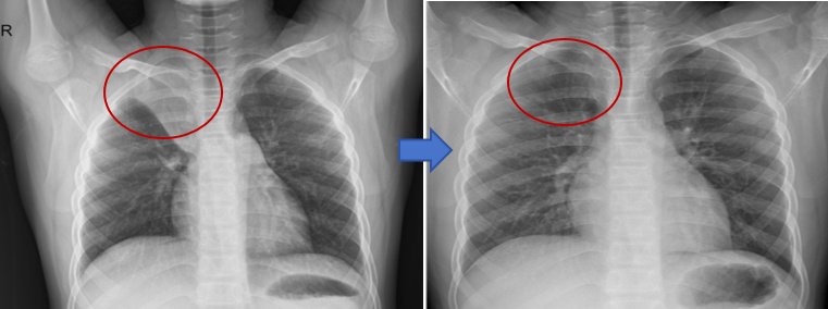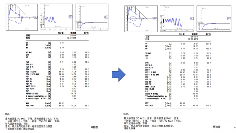 呼吸康复门诊的呼吸专科医生、康复医生、呼吸专科护士共同查阅了小杰近期的肺功能报告和胸部影像。呼吸专科医生对小杰进行了的呼吸肌力、六分钟步行试验等评估,并向小杰妈妈耐心解释道:“小杰的肺部经历了一场重病,要让肺功能恢复到正常状态,还需要借助康复训练来达成。”随后,呼吸专科医生和康复科医生共同为小杰制定了一套详细的呼吸康复训练方案,呼吸专科护士具体指导小杰学习训练方案中的缩唇腹式呼吸、三球式呼吸训练器的使用、有效咳嗽方法以及体位引流等内容(如图1所示),并定期使用微信沟通督查训练。一个月后,小杰再次来到呼吸康复门诊进行随访,令人欣慰的是,小杰的各项肺功能指标以及胸部影像较之前都有了明显的好转(如图2、图3所示)