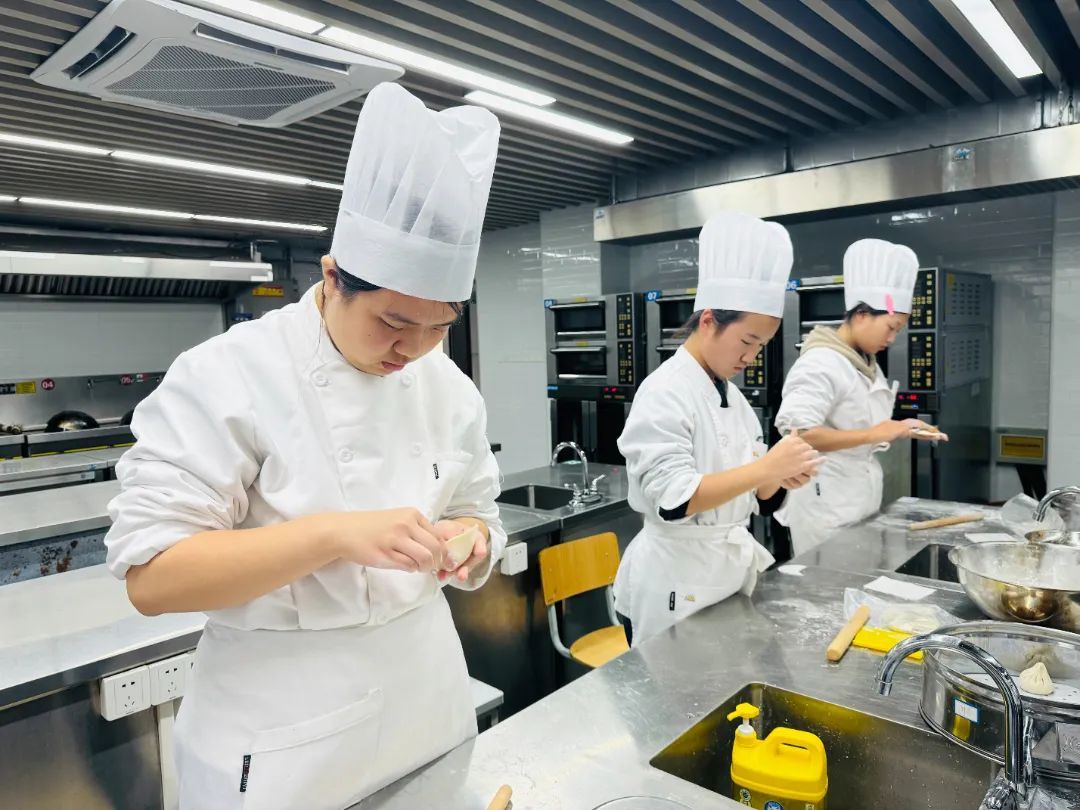 而来自上海欧润吉食品有限公司的员工朱悦,也成为了学生们的指导老师,在指导学生们制作中式面点时,他总会将日常生产中面临的技术难题、解决办法以幽默风趣的方式教授给学生。“特别是温度、气候因素的影响,学生们必须做到了然于胸,这有助于他们今后的就业。”朱悦说。