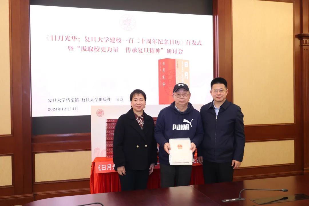 今天(12月14日)下午,由复日大学档案馆、复旦大学出版社主办的《日月光华:复旦大学建校一百二十周年纪念日历》(以下简称:复旦日历)首发式暨“汲取校史力量 传承复旦精神”研讨会举行。校党委副书记周虎,校党委常委、党委组织部部长艾竹,校党委常委、党委宣传部部长方明等出席。
