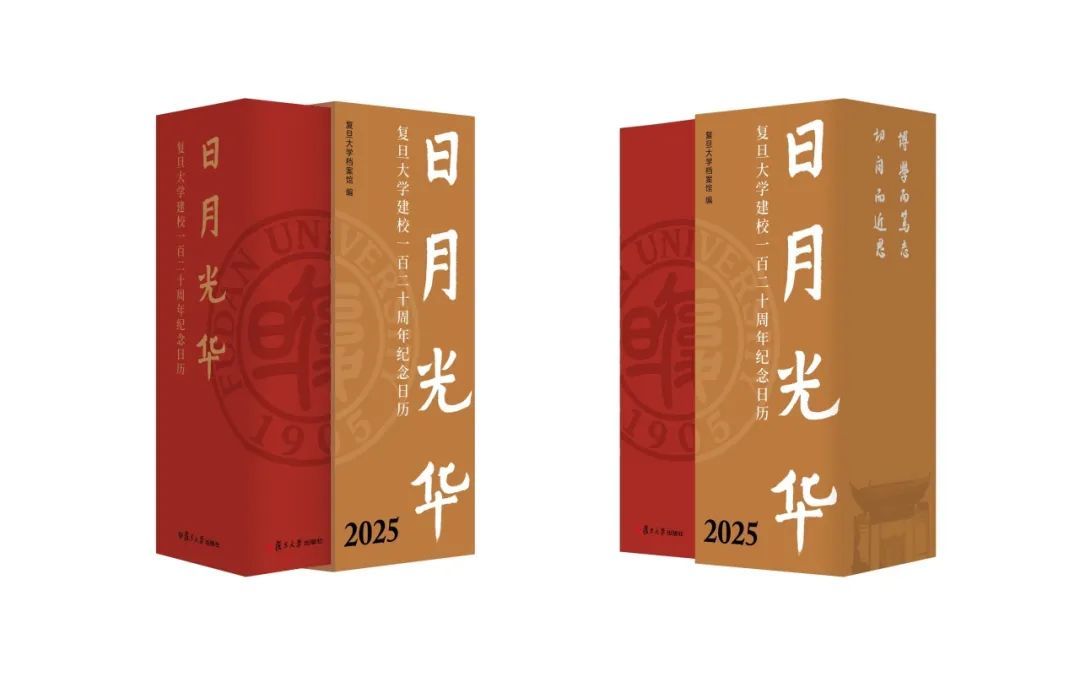 复旦日历的封面和版式设计几易其稿,最终定稿以精装加半函套的形式呈现。为迎接复旦大学建校120周年,外封选用喜庆醒目的复旦红,书名烫金,校徽烫透明珠光白;内封选用沉稳内敛的复旦蓝,印专金。函套为雅致的金色,烫七彩银。