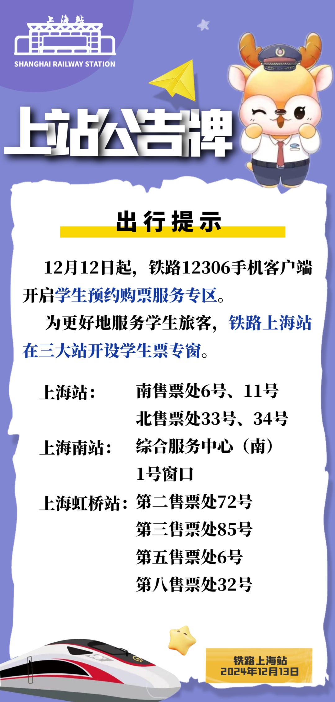 铁路上海站介绍,12月12日起,铁路12306客户端已开启学生预约购票服务专区。为更好地服务学生旅客,铁路上海站在三大站开设学生票专窗。具体位置详见↓