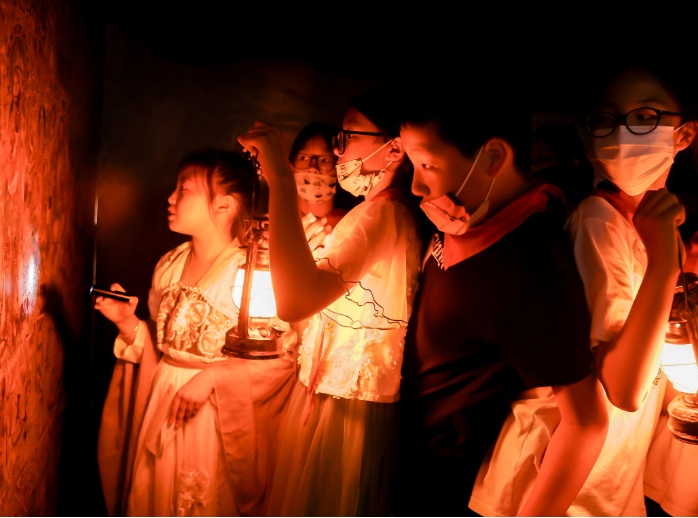 “孩子们如果缺乏详细的接触和了解,很难通过普通课堂教学感受到中华优秀传统文化中美的震撼。”因此,王丽丽和同事们策划了“我是小策展人-有趣的三兔共耳图”跨学科项目,设计了相关的教学内容和实施流程,将“敦煌奇境”文化展的第“220窟”的仿真壁画、复原乐器、模型窟等作为课程资源引入校园,开展了角色扮演、故事线索寻踪、仿真洞窟探秘、制作模型窟等活动体验课程,赢得学生的喜爱。