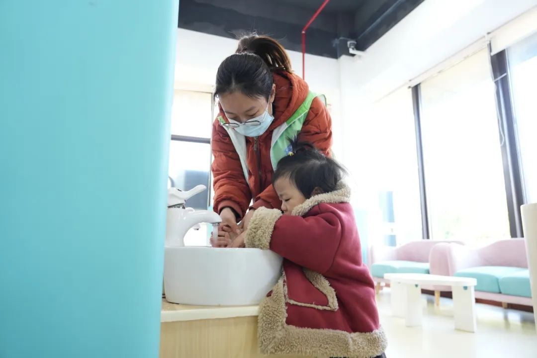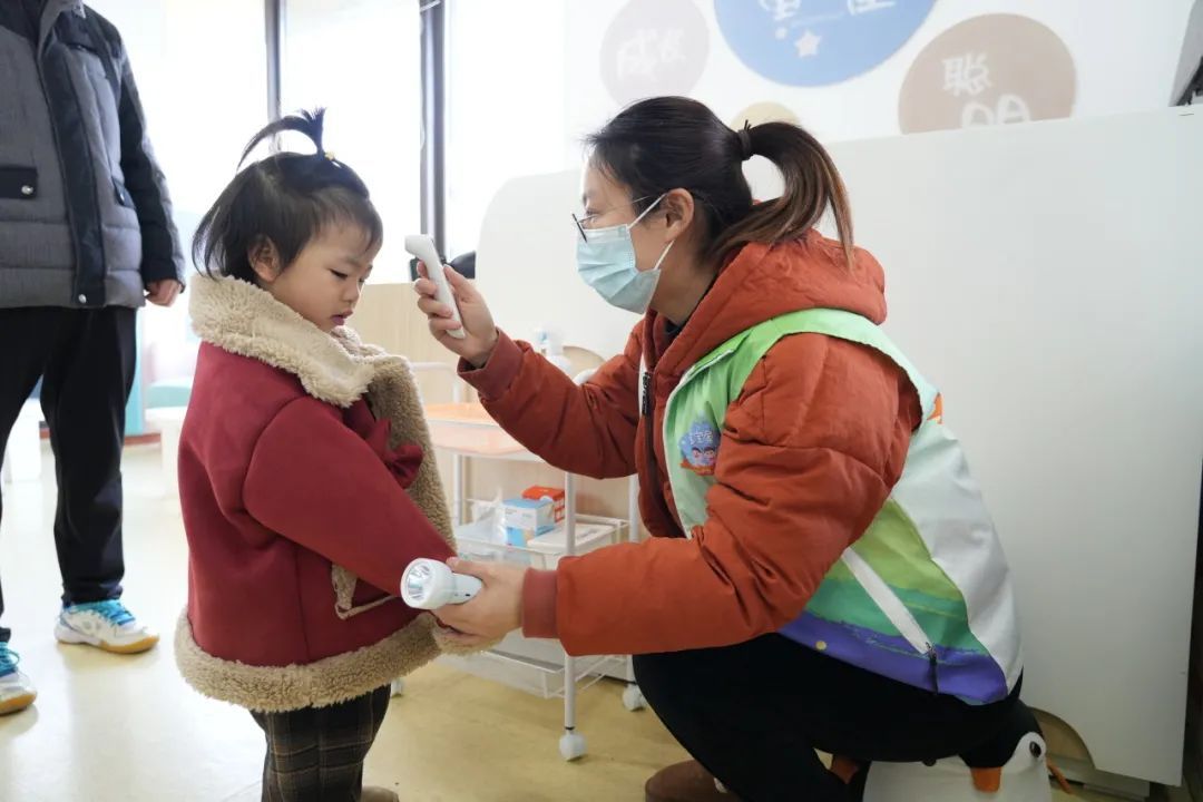“宝宝,早上好呀!进门先来量一下体温!”冬季是传染病高发期,桐南美麓宝宝屋的保健老师严格执行防范措施,每次的晨检都牢牢把关,检查宝宝们的精神状态及身体状况,并引导他们完成手部清洗,为宝宝们的健康安全保驾护航。