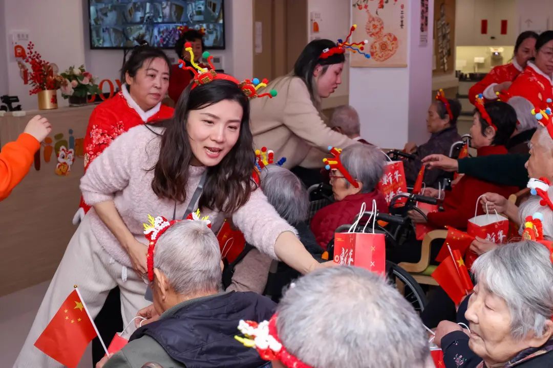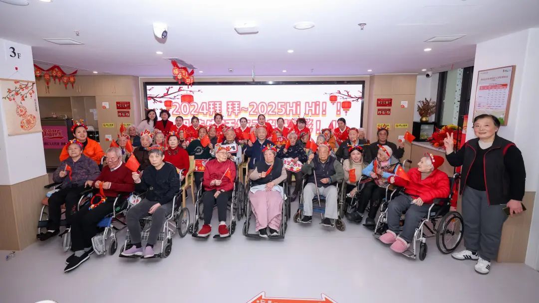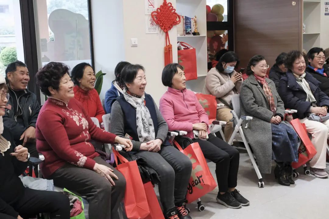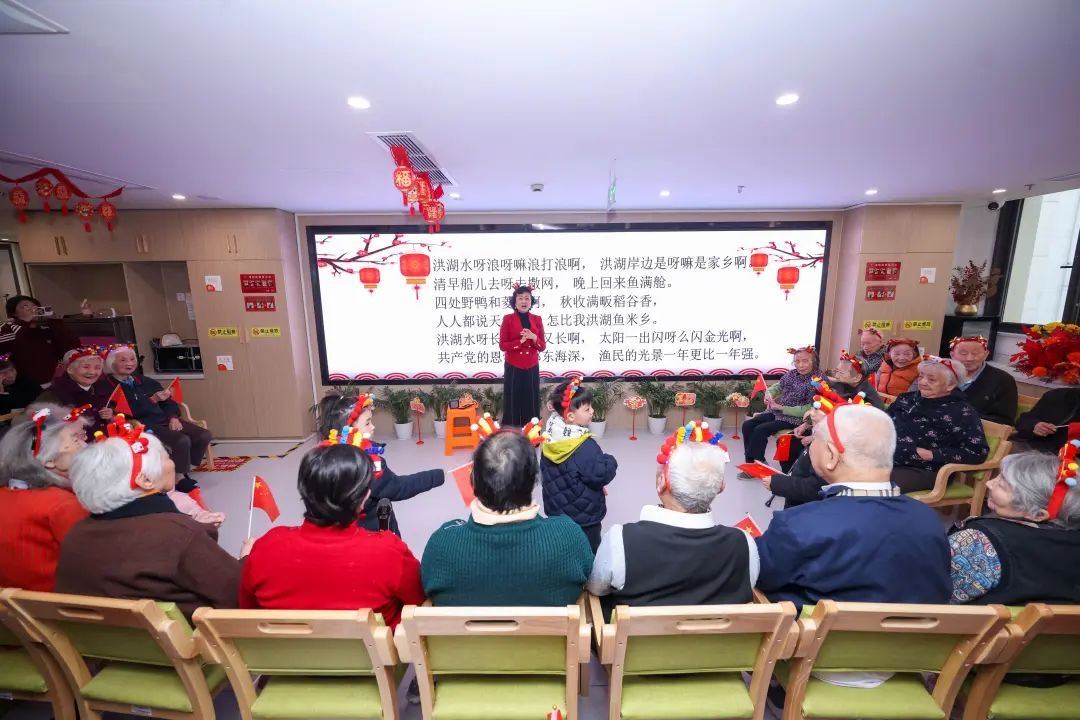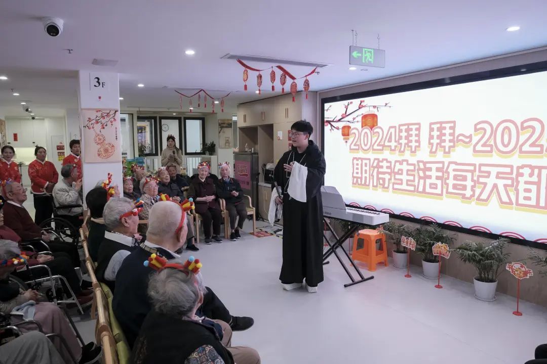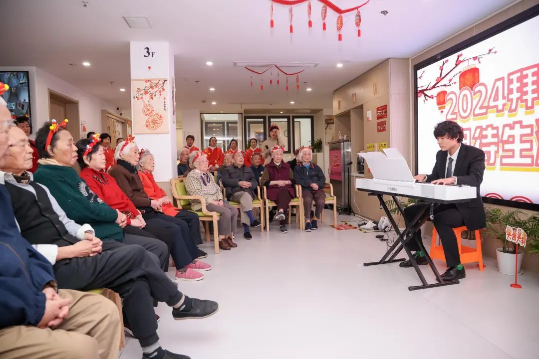 在三楼的长者照护中心,爷爷奶奶们虽然行动不便,但他们的迎新活动同样精彩纷呈。14:30,由“陪伴爷爷奶奶一小时”为老服务项目共建单位(团队)——“益启爱”上海国际学校敬老小分队、上海星光幼儿园等志愿团队精心策划的敬老迎新活动正式拉开帷幕。京剧的韵味、钢琴的悠扬、合唱团的激情,每一曲都如同心灵的慰藉,让爷爷奶奶们感受到了家的温暖和节日的喜庆。
