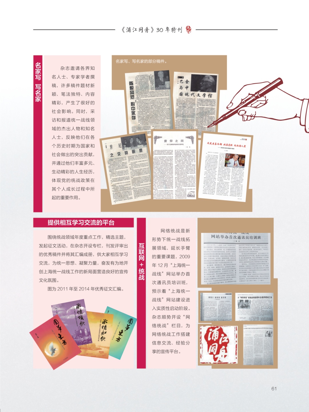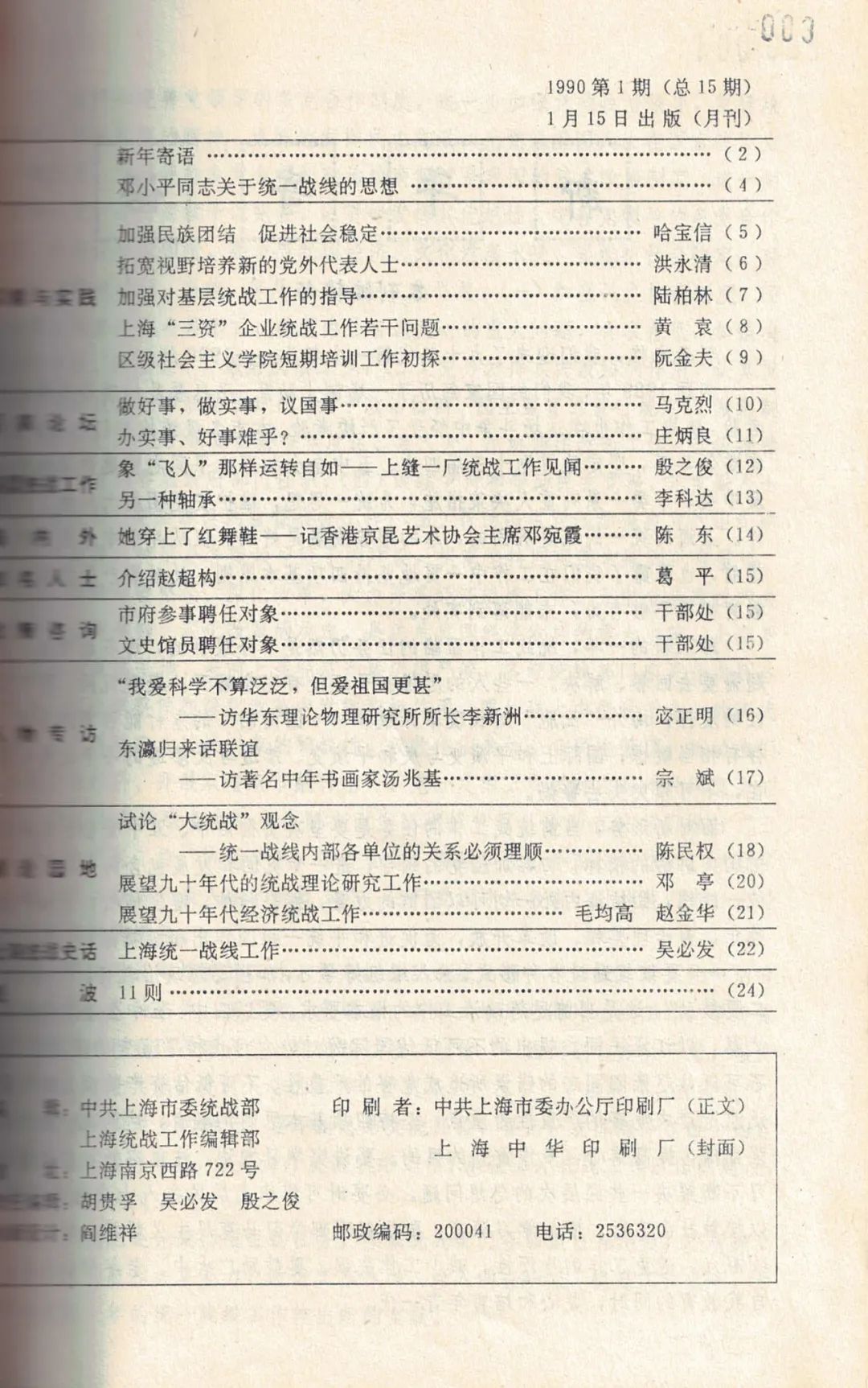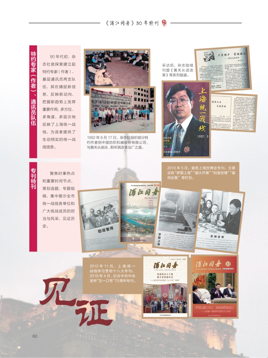 就这样,在20世纪90年代初,杂志就探索建立起特约专家(作者)、基层通讯员两支队伍,在捕捉新信息、反映新动向、把握新趋势上发挥了重要作用,多方位、多角度、多层次地宣传了上海统一战线,为读者提供了生动详实的统一战线信息。