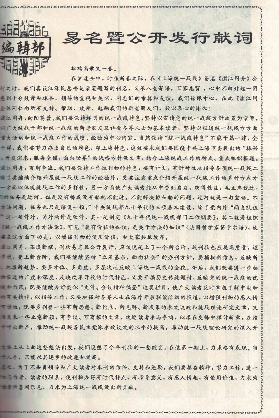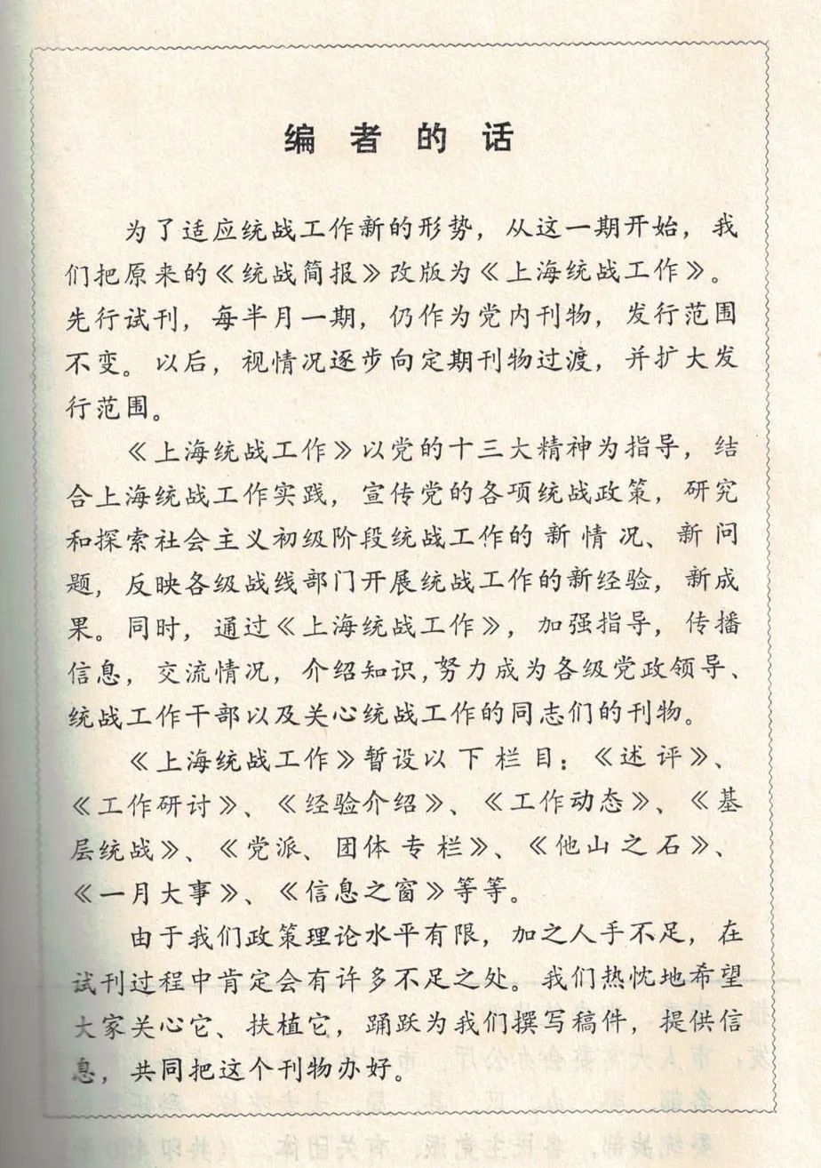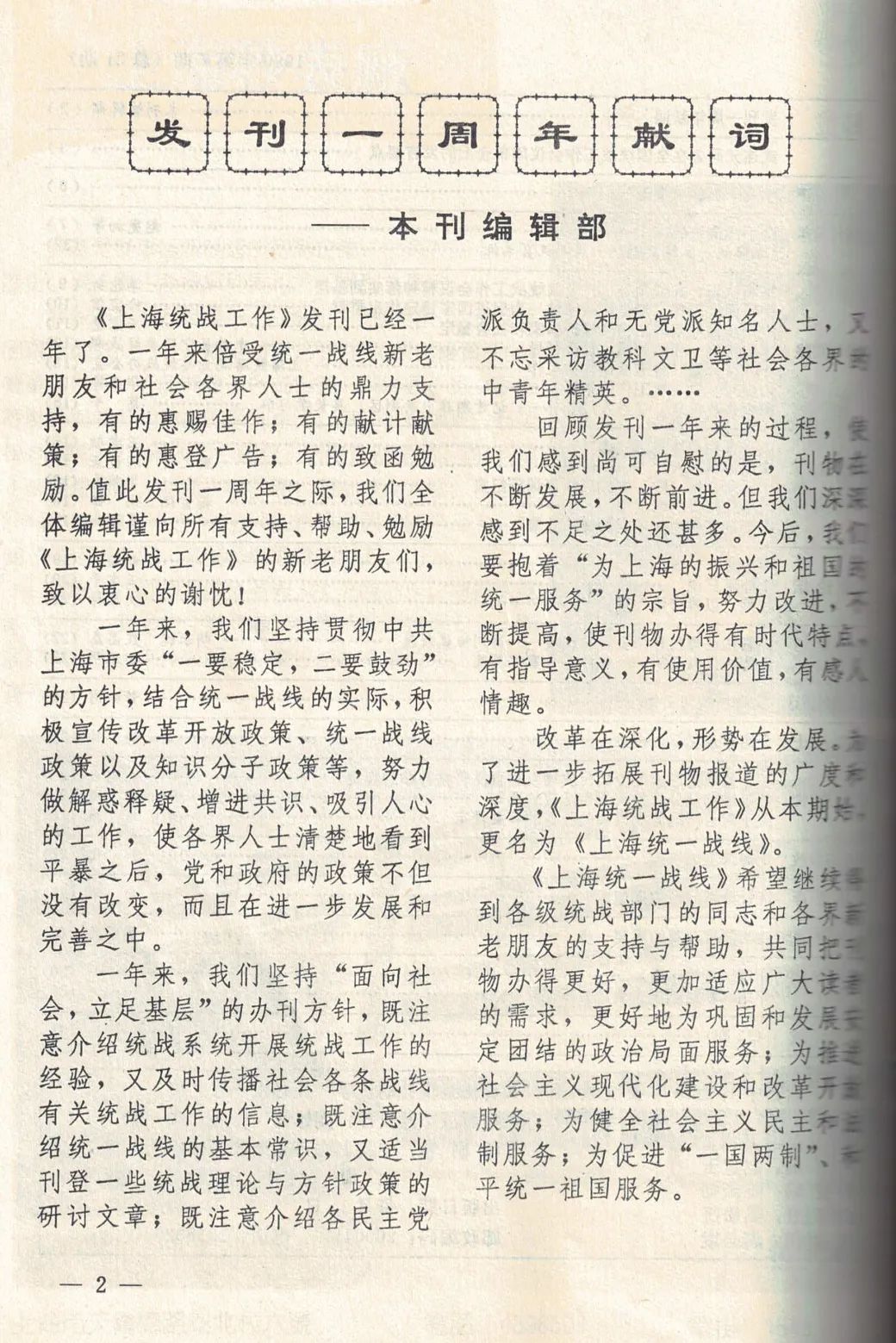 为使刊物办的有时代特点、有指导意义、有使用价值、有感人情趣,进一步拓展刊物报道的广度和深度,《上海统战工作》发刊一年后,更名为《上海统一战线》。