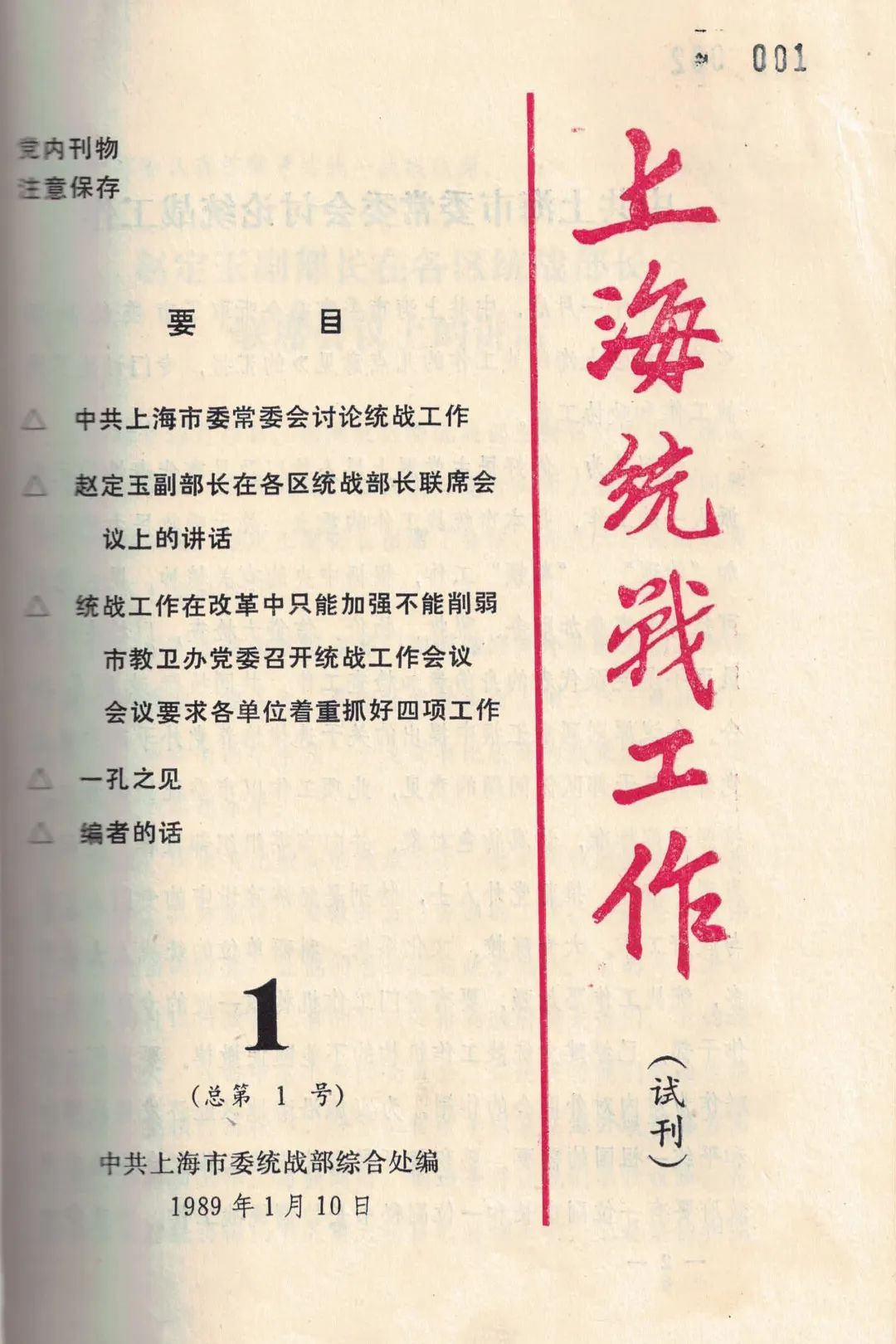 左图:1989年1月《上海统战工作》创刊,图为第一期试刊