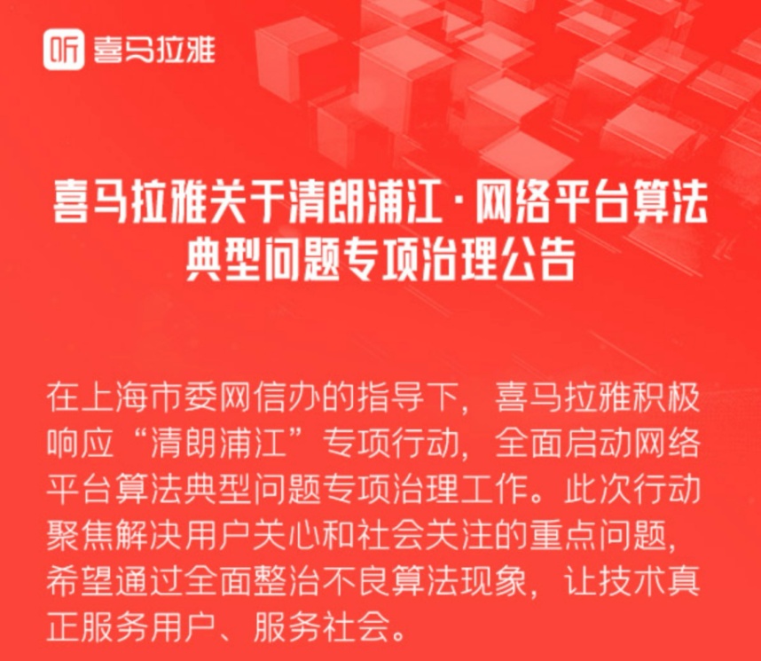 近日,在上海市委网信办指导下,小红书、得物、喜马拉雅、哔哩哔哩、拼多多、饿了么、大众点评、携程、SOUL、叮咚买菜、星野、跃问等网站平台陆续发布了“清朗浦江·网络平台算法典型问题治理”专项行动治理公告,并公布网民投诉举报反馈渠道,表态主动接受社会监督,将根据网民反映的问题调整优化算法应用,促进算法应用向上向善。