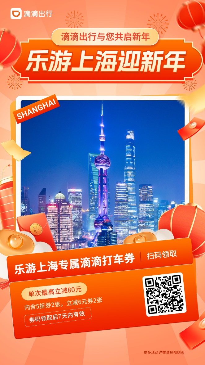 通过滴滴出行App或微信小程序打车,起点或终点设置在参与活动的区域内,选择特惠/快车/特快,即可享受超值优惠!点击查看→乐游上海迎新年!5折专属打车福利已就位!
