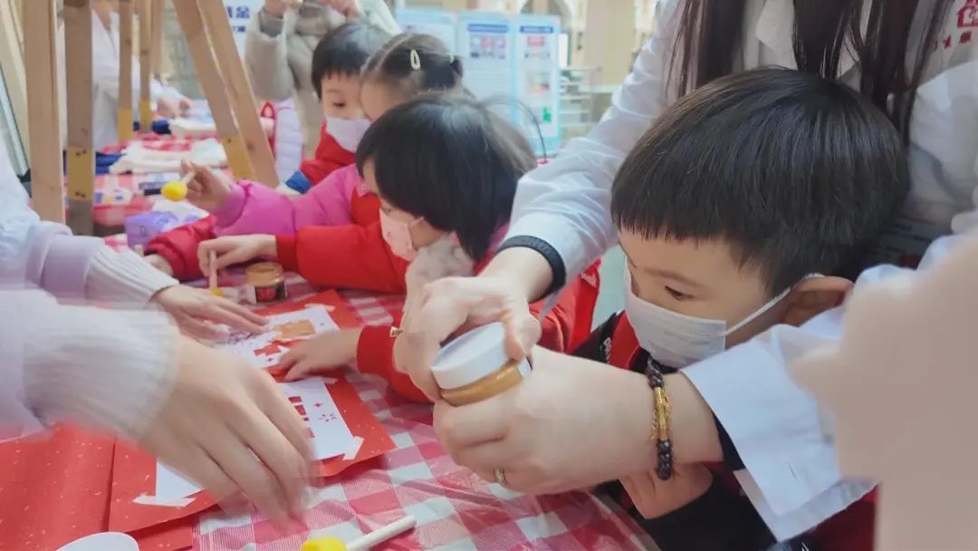 此外,活动还设置了儿童新春拓福和包香囊两个互动环节。在新春拓福活动中,孩子们亲手拓印福字,将其作为新年装饰带回家,既增进了亲子关系,又寓意着新年健康、幸福。在包香囊活动中,孩子们传承中医文化,动手制作防治四时流感的香囊,了解了中药材的基本功效,培养了对传统医学的兴趣。