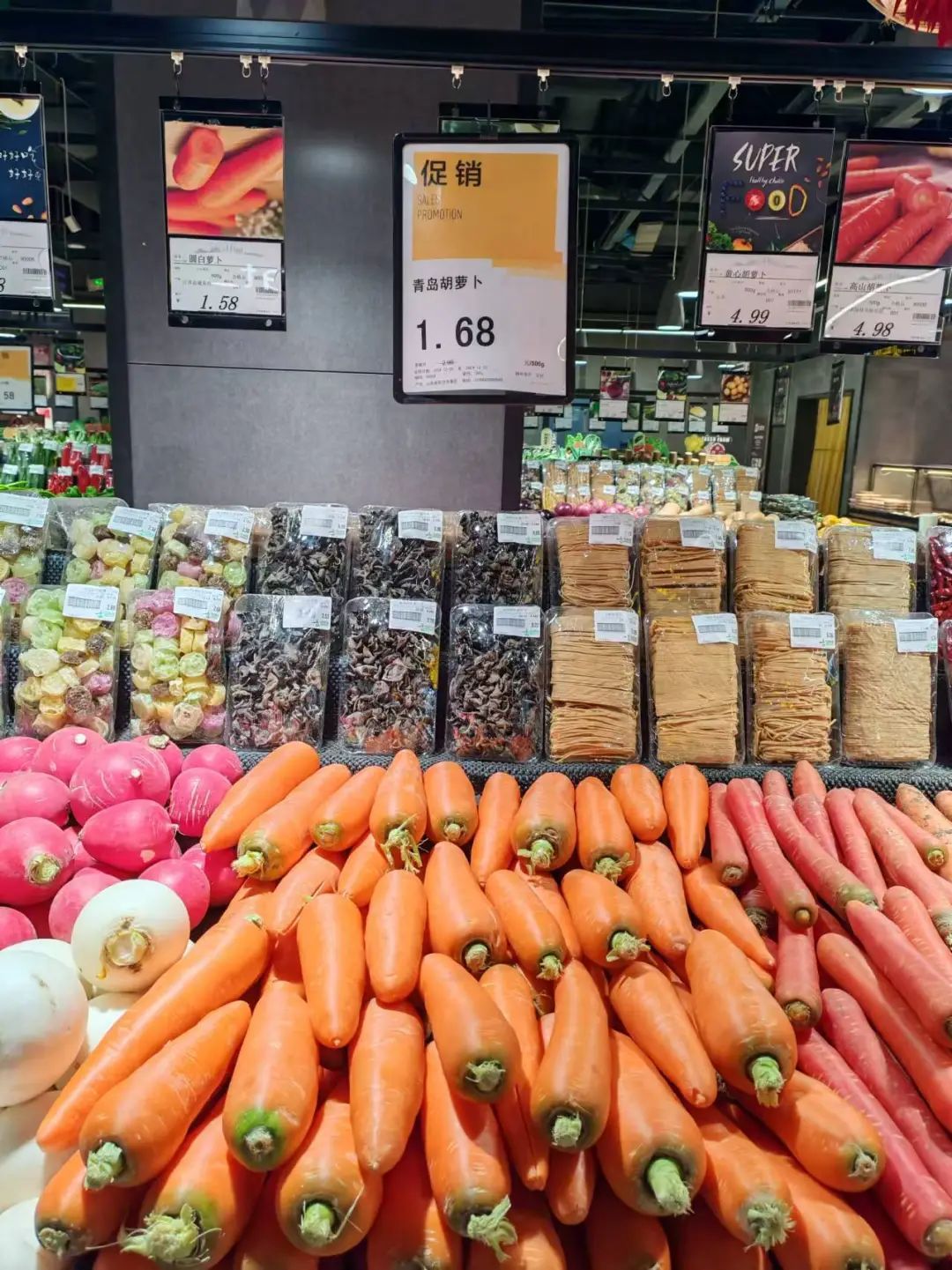 走进吉麦隆的生鲜区,各类蔬果品类齐全。这里的蔬菜生鲜每天坚持源头基地直采,通过其自有运输链,以最快的速度从田间地头直达居民菜篮子,最大限度保证生鲜优良品质,让消费者买得放心、吃得安心。