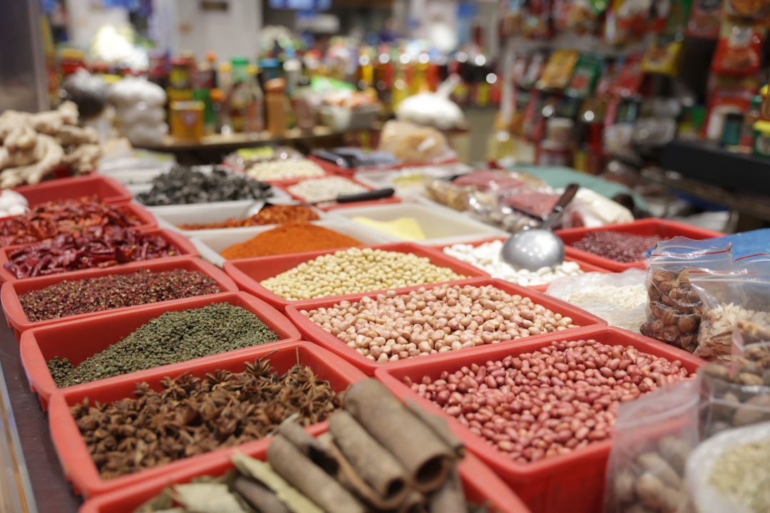 除了蔬菜,集市上还有各种调料与干货。花生被细心地剥去外壳,是火锅边不可或缺的下酒小菜;小黄豆提前泡发,慢火熬煮成浓郁的豆浆,可以加入火锅汤底;各种麻辣锅底是火锅的灵魂伴侣,麻辣鲜香与新鲜食材相遇,在滚烫的汤水中交织出一场味蕾的盛宴。